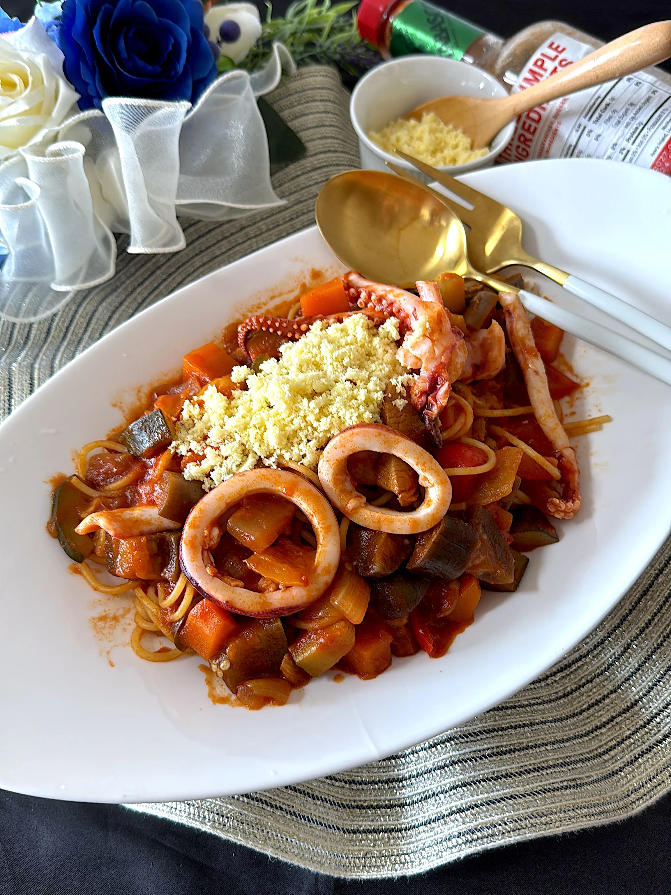 #イカ&タコ料理グランプリ2025 #ラタトゥイユリメイク #ラタトゥイユイカ入りパスタ #スパゲティ #トマトソース #簡単料理 #オイスターソース #コンソメ