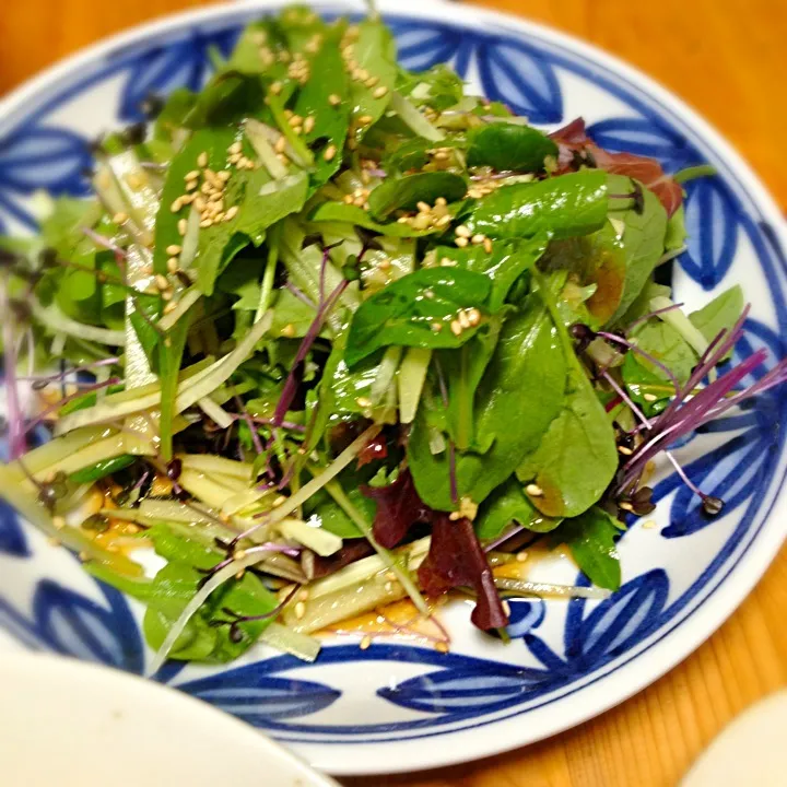 ポン酢、ごま油、微塵切りにした生姜、醤油を混ぜてドレッシングを作り野菜にかけて最後にいりごまをぱらりとして完成