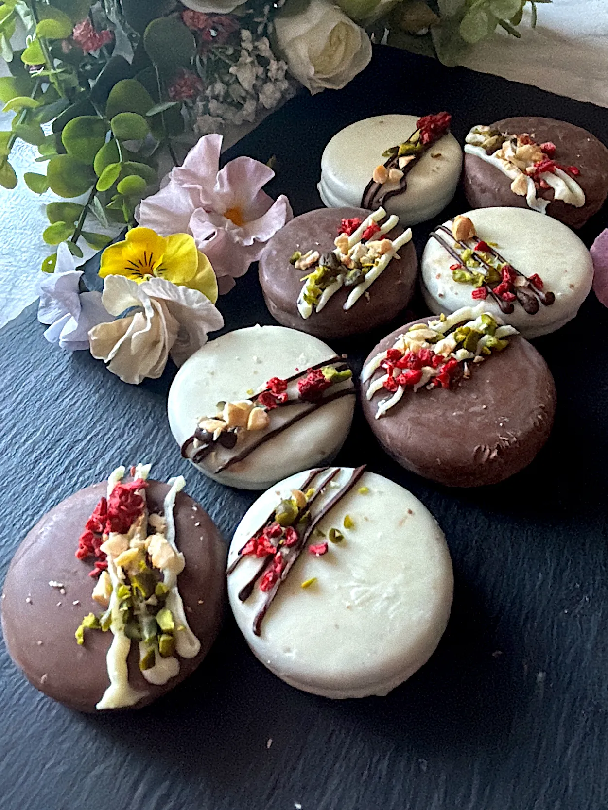 ホワイトチョコレートのは線を全部つけてからトッピングしたのでよくつかず😭