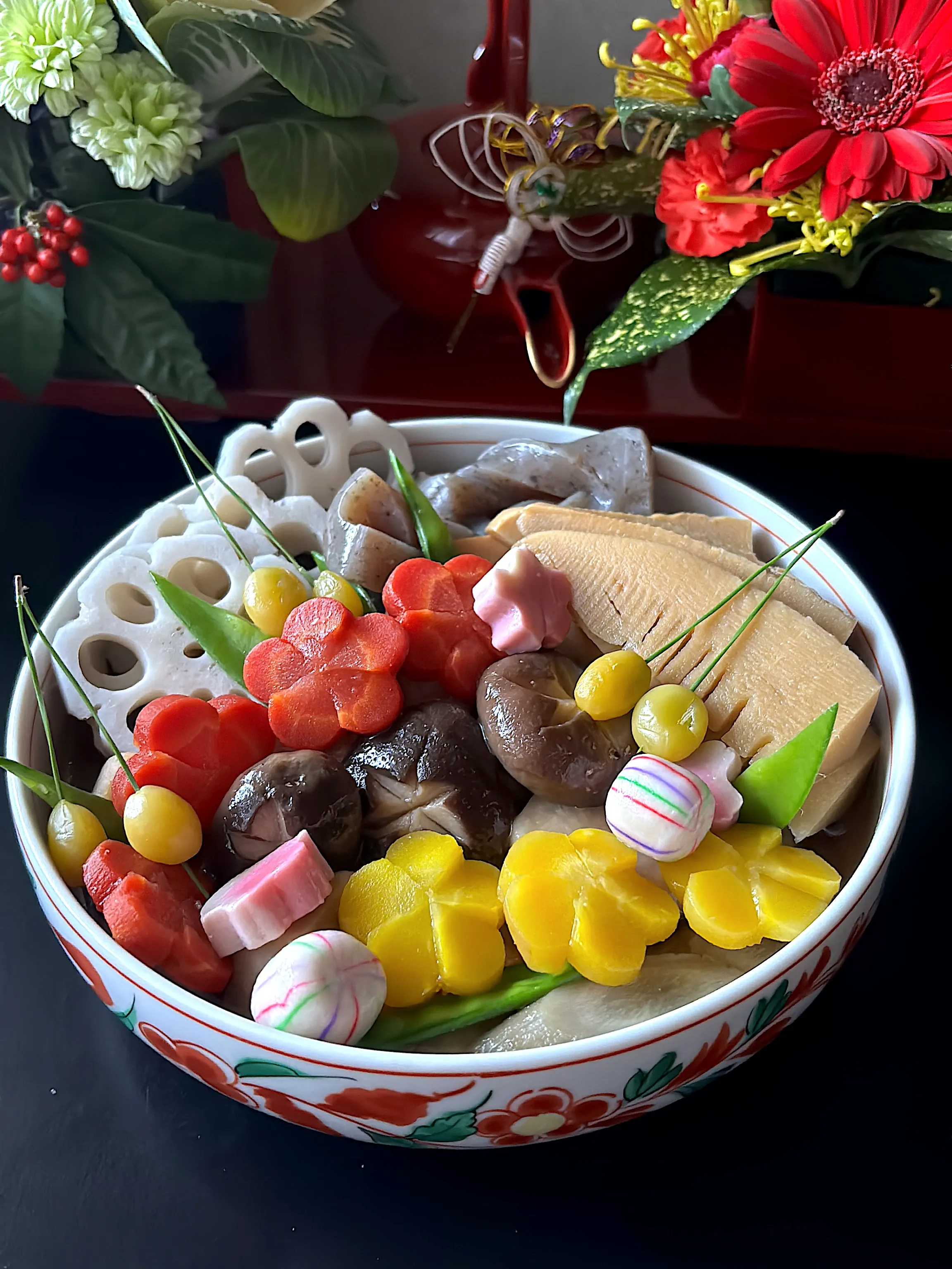 蓮根は歯応え残したいのでおまかせ酢でちょい煮してから煮染めに添えてます ~色弱め🤍