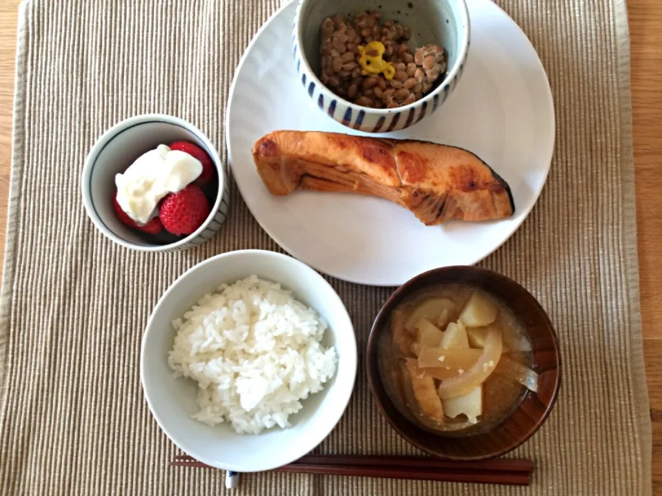 シャケ、納豆、お味噌汁に炊きたてのご飯 最後はいちごまで