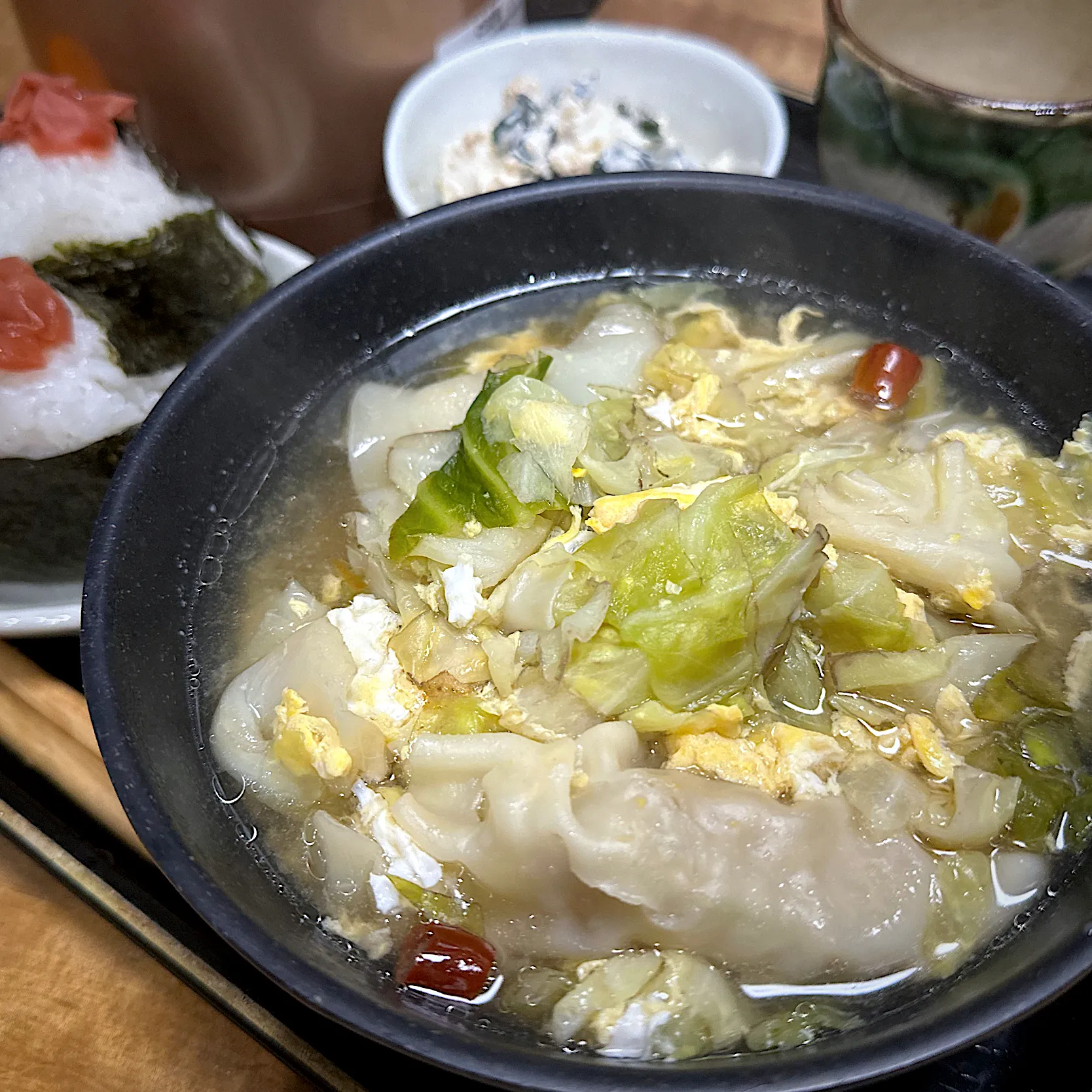 昨晩はフライパンにぶっ込みボロネーゼ風スパゲッティ作りましたが、今回は鍋に冷凍餃子、ざく切りキャベツ、鶏がらスープ、ナンプラー、黒酢、唐辛子をぶっ込み、最後に溶き卵を加えて、サンラータン風スープです。なんでも「風」つけとけば許されると思ってるひと😅