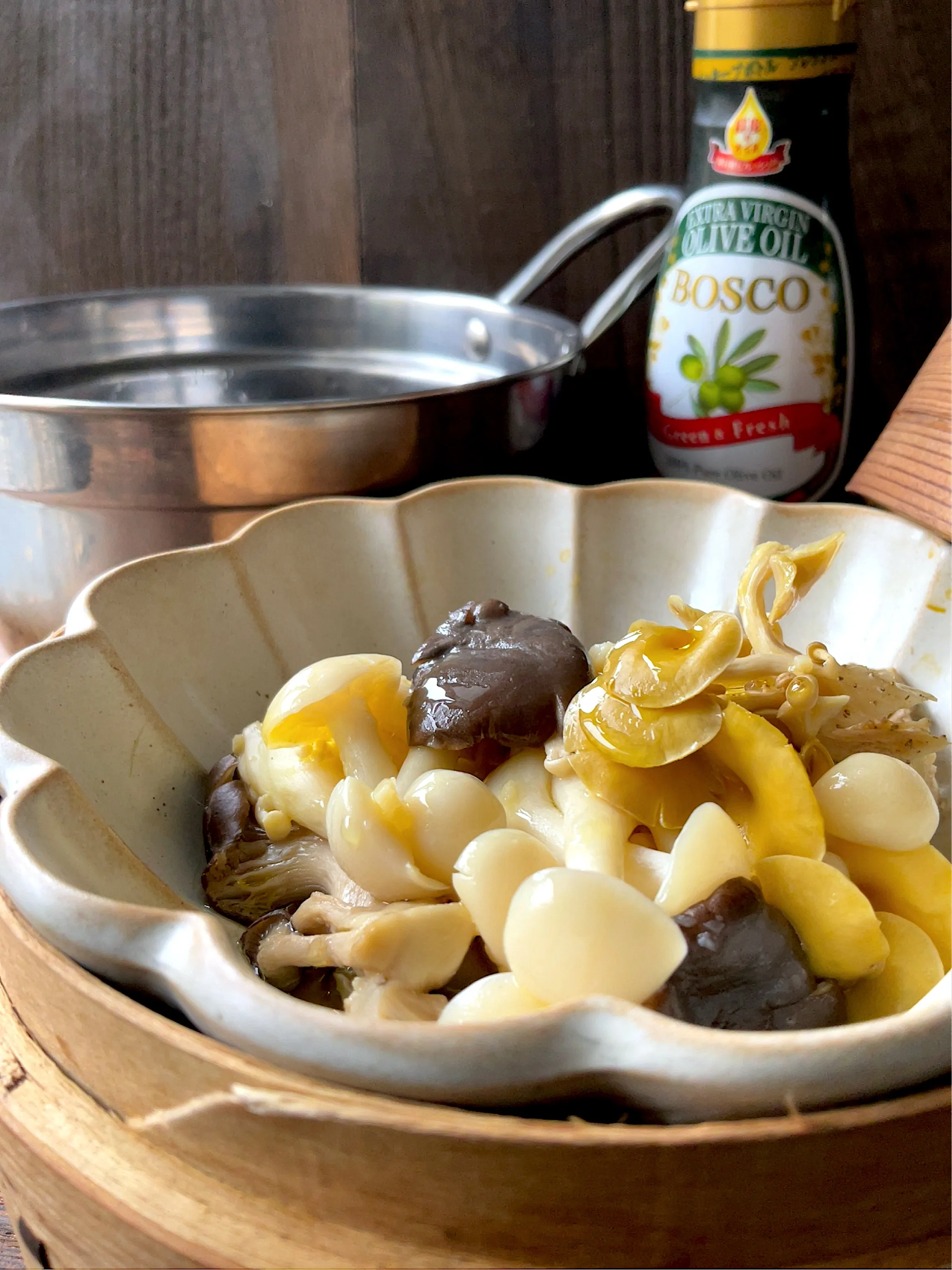 #snapdish #蒸し料理にかけるオイル #オリーブオイル #せいろ蒸し #蒸籠蒸し #たもぎたけ #ひらたけ #きのこ #マリネ #きのこのマリネ #ブナピー #まあるい塩 #タモギタケ