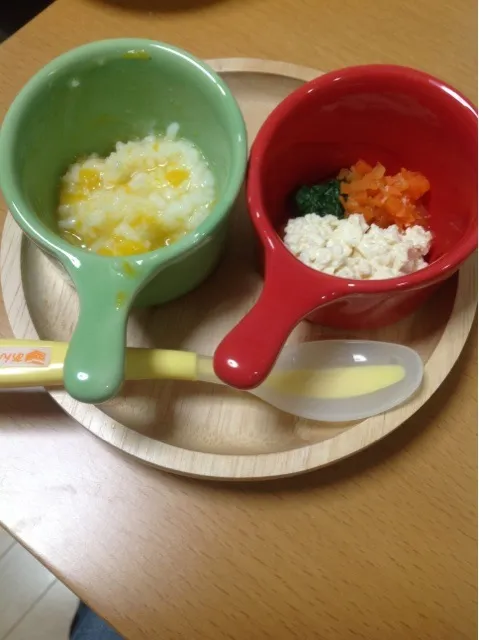 夜:7倍粥かぼちゃ和え、絹ごし豆腐の人参小松菜和え【ほぼ完食】
