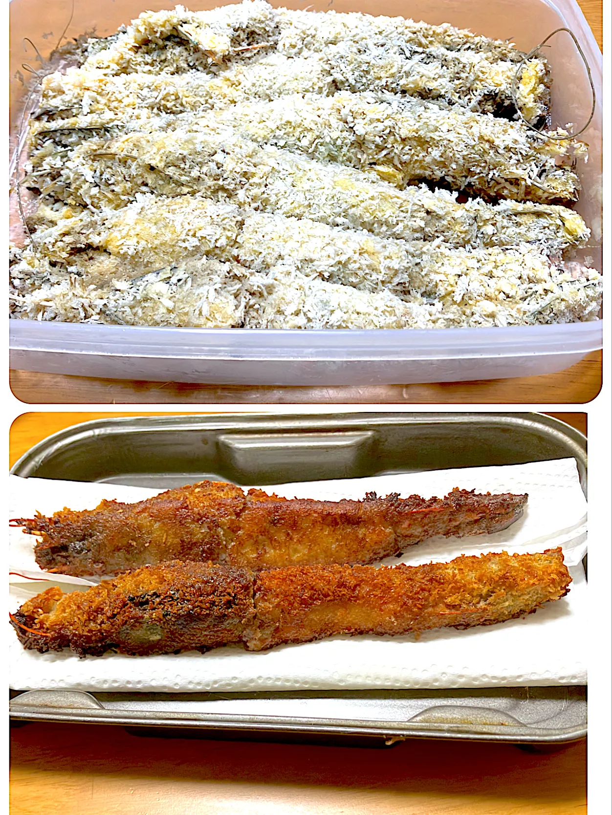 作ったまま冷凍しといた【有難みが微妙に感じられないエビフライ】冷凍庫の底にあったので忘れてた💦しかも何を思ったのかしっぽも頭も衣付けてた😅 半額494円で買った特大ブラックタイガー頭付き 大失敗