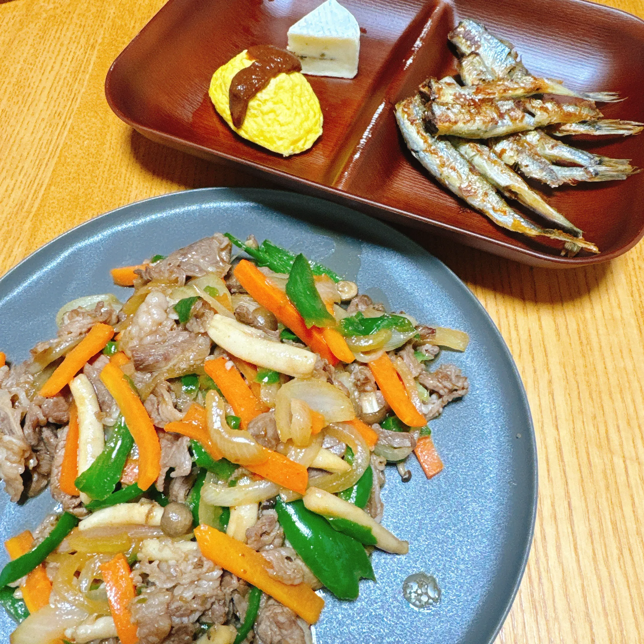 プルコギ 頭のないししゃも…(頭ついてる方が好き🥺) 冷凍のオムレツ、カマンベールチーズ