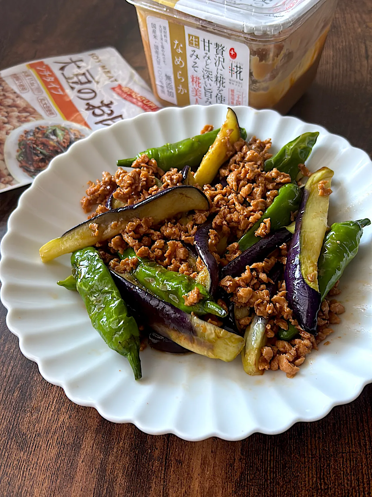 #大豆のお肉で茄子とししとうの肉そぼろ