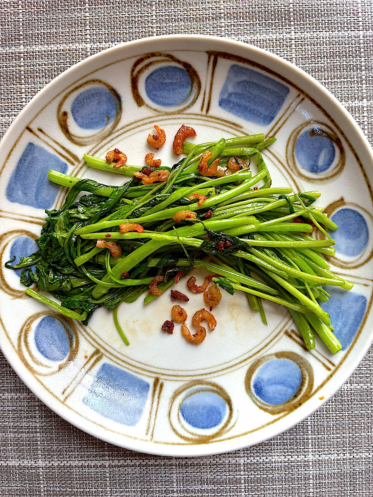 今が旬の空芯菜をシンプルな味付けで、塩味に干し海老の風味がシャキシャキの空芯菜と良く合います。家庭で本格中華を!
