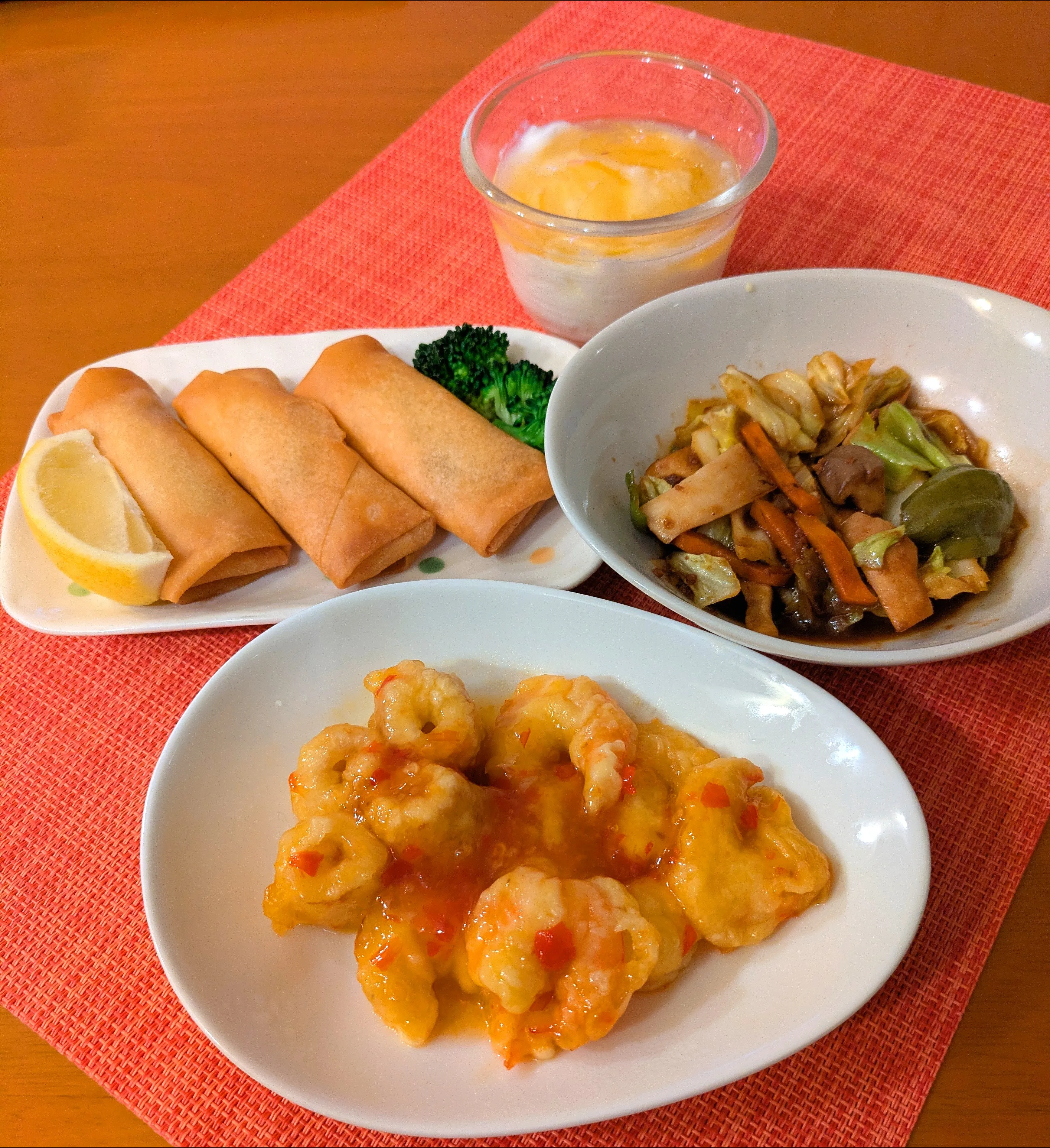 #夕食#エビチリ#回鍋肉#味噌炒め#春巻#ヨーグルト