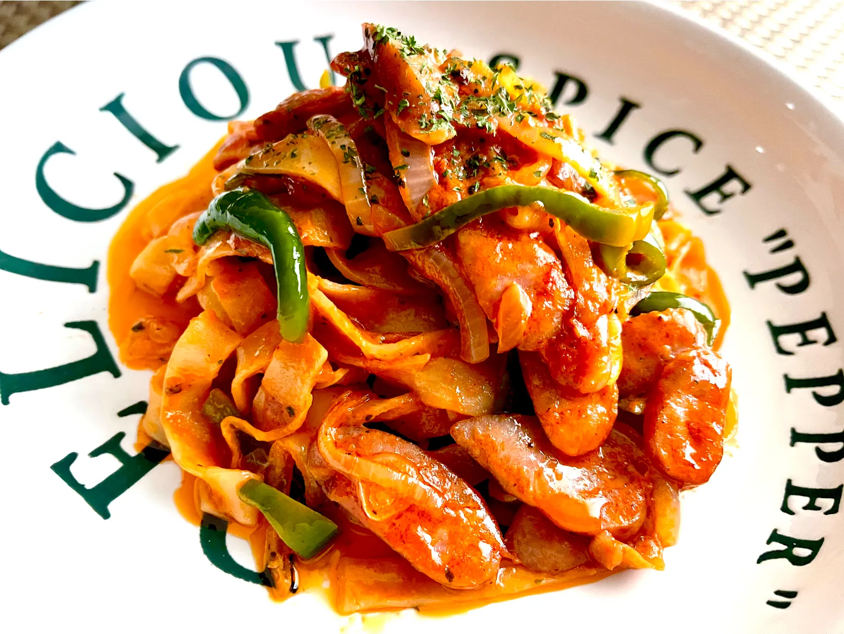 玉葱🧅ピーマン🫑とナポリタン具材にチョリソーと生クリームを少し足して ナポリタン風フィットチーネ