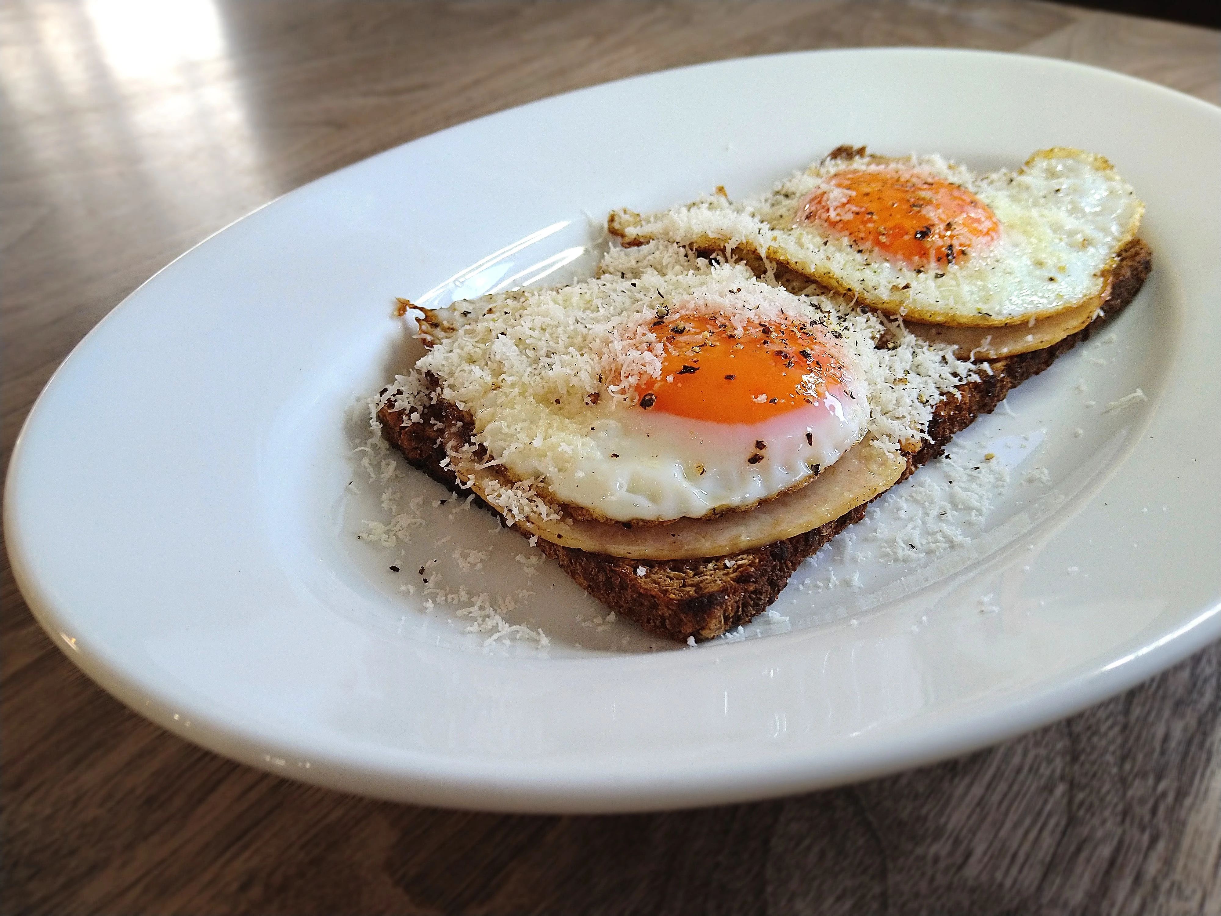 バターで焼いたパンにハムエッグをのせ パルミジャーノを掛けるだけ