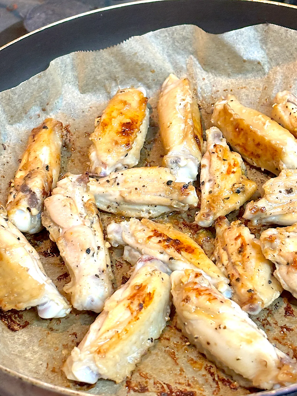 フライパンにクッキングペーパーを乗せて手羽中を皮目から焼く