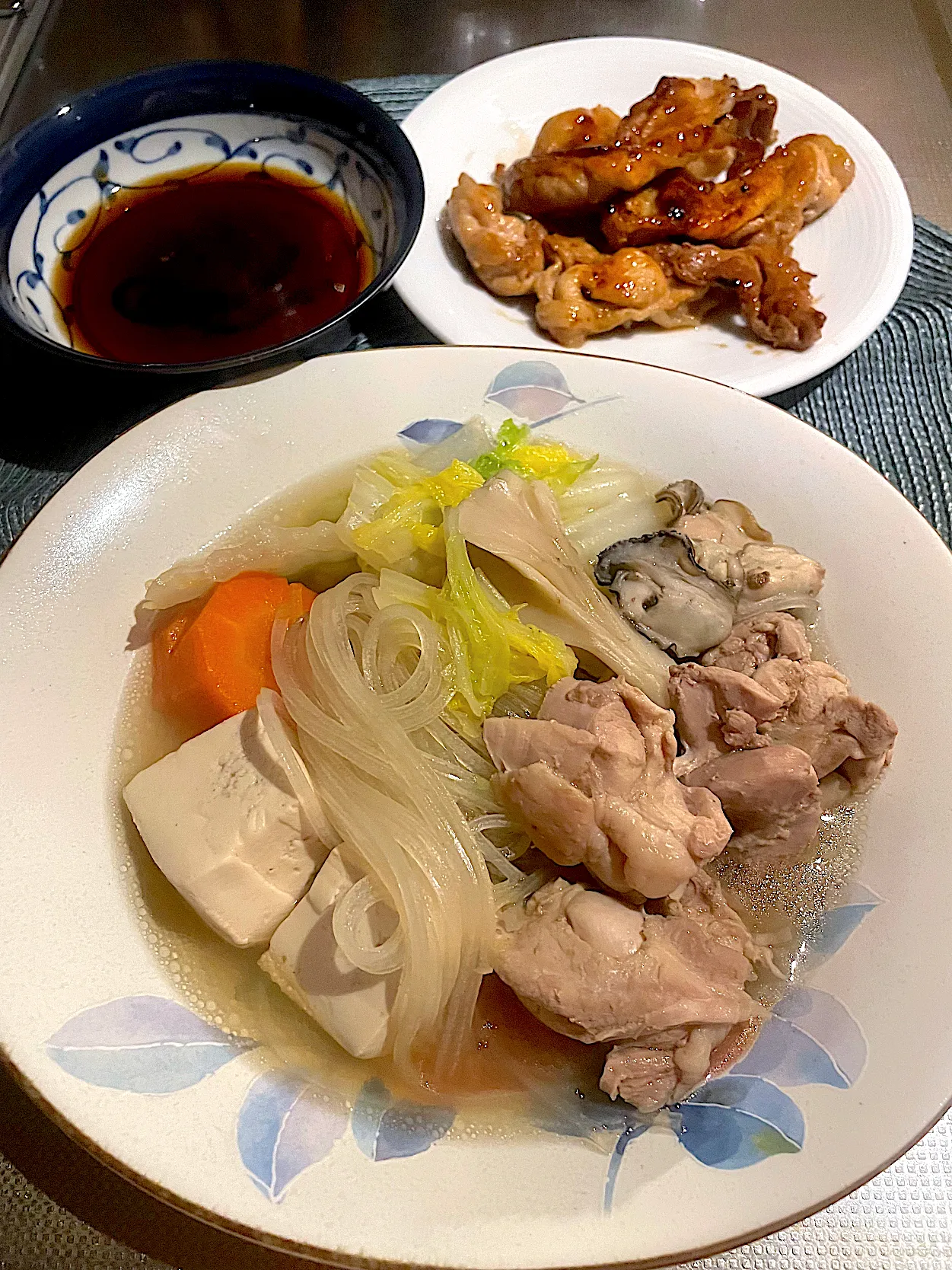 鶏肉、牡蠣、豆腐、大根、人参、白菜、舞茸、マロニー