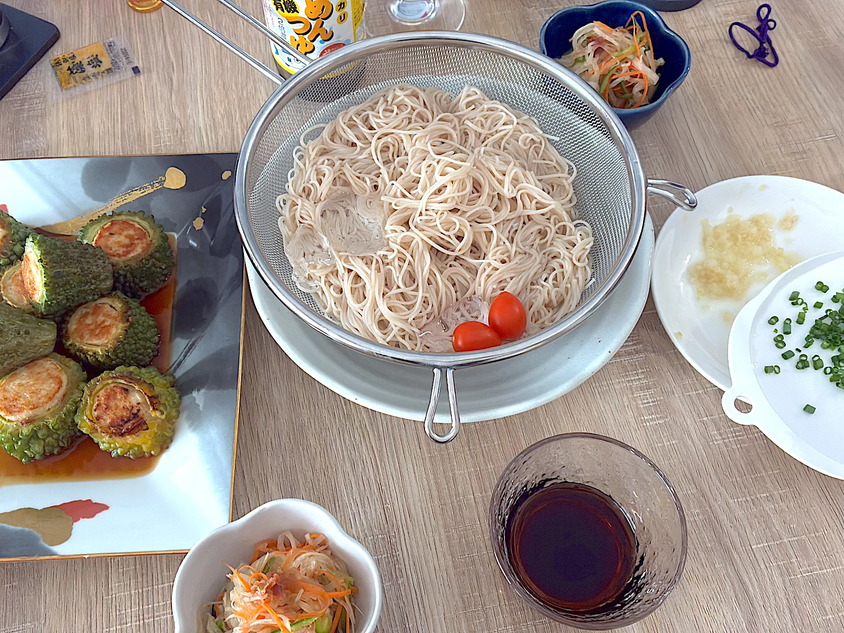 全粒粉素麺、ベランダ菜園ミニトマト、ゴーヤの肉詰め甘酢あんかけ、大根とピーマンの梅おかかサラダ