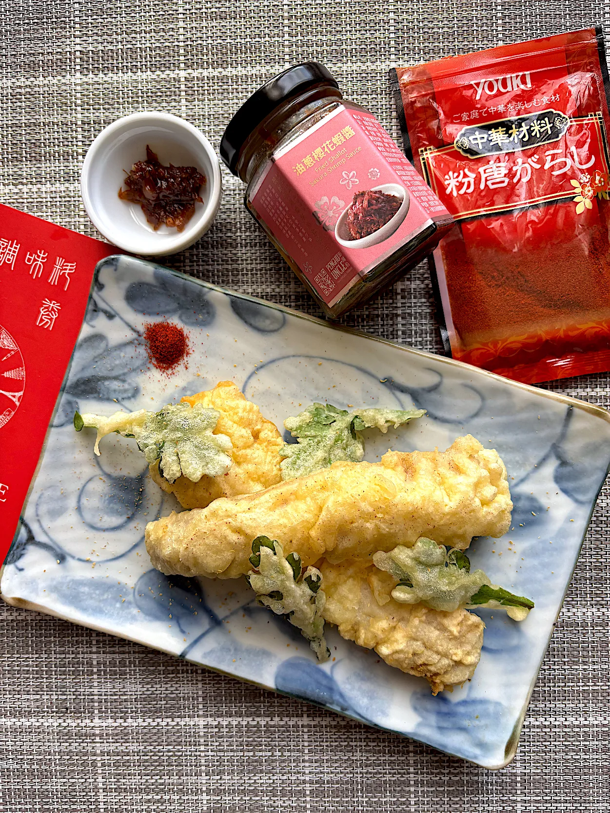 唐辛子、海老醬をふわっとしたはもに付けてお酒のおつまみに。春菊も良いアクセントに!