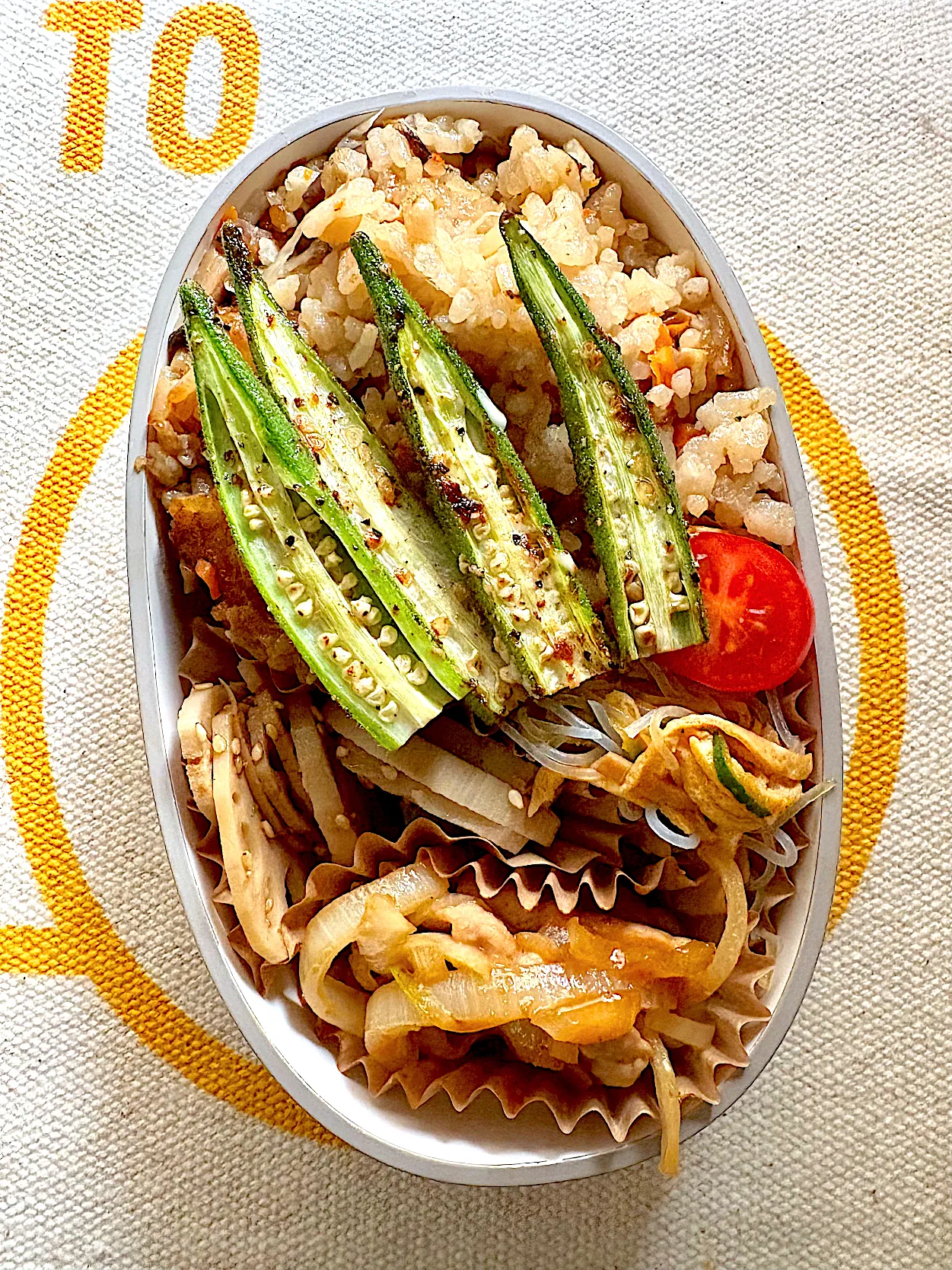 炊き込みご飯、蓮根のきんぴら、春雨サラダ、豚焼肉、オクラの塩焼き #お弁当