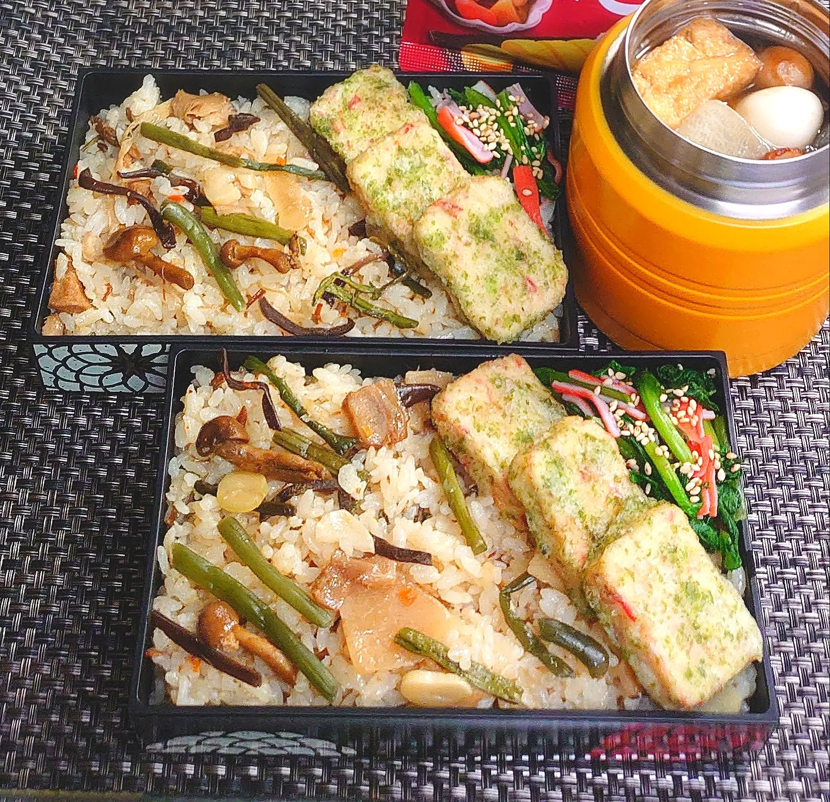 山菜たっぷりの山菜ごはんと温かいおでん🍢で、今日もランチが楽しみだね🎶