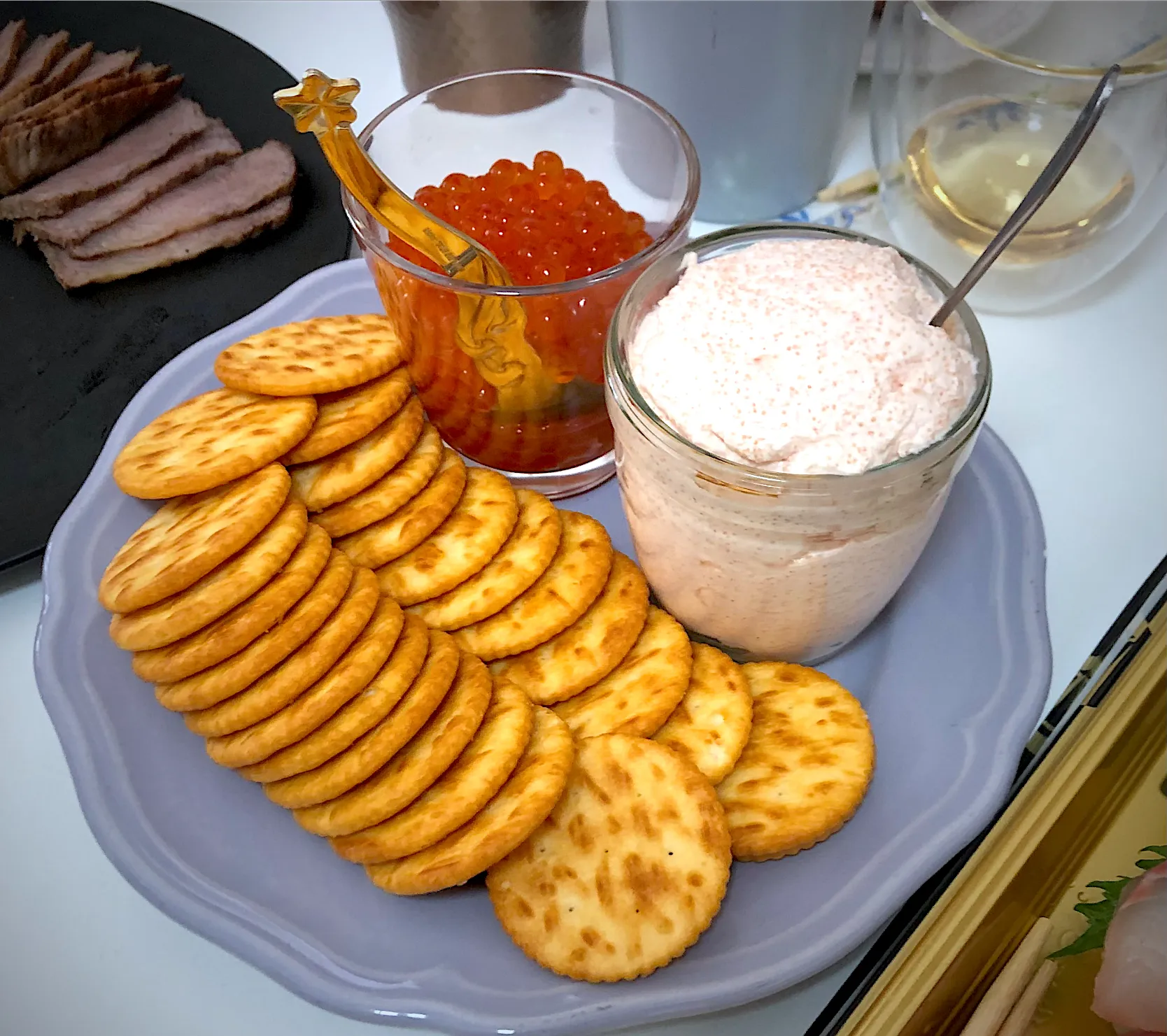 クリームチーズとたらこを適量混ぜ合わせ、クラッカーにチーズを塗っていくらを好きなだけ乗せます😃 #簡単 #