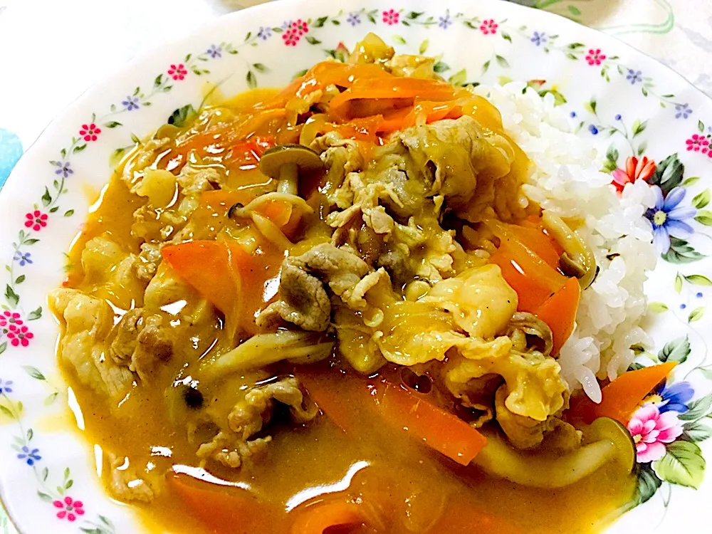 豚肉、しめじ、マッシュルーム、玉ねぎ、人参入りで。きのこ類多めに入れてヘルシーに仕上げました!ライスは押し麦入りで。