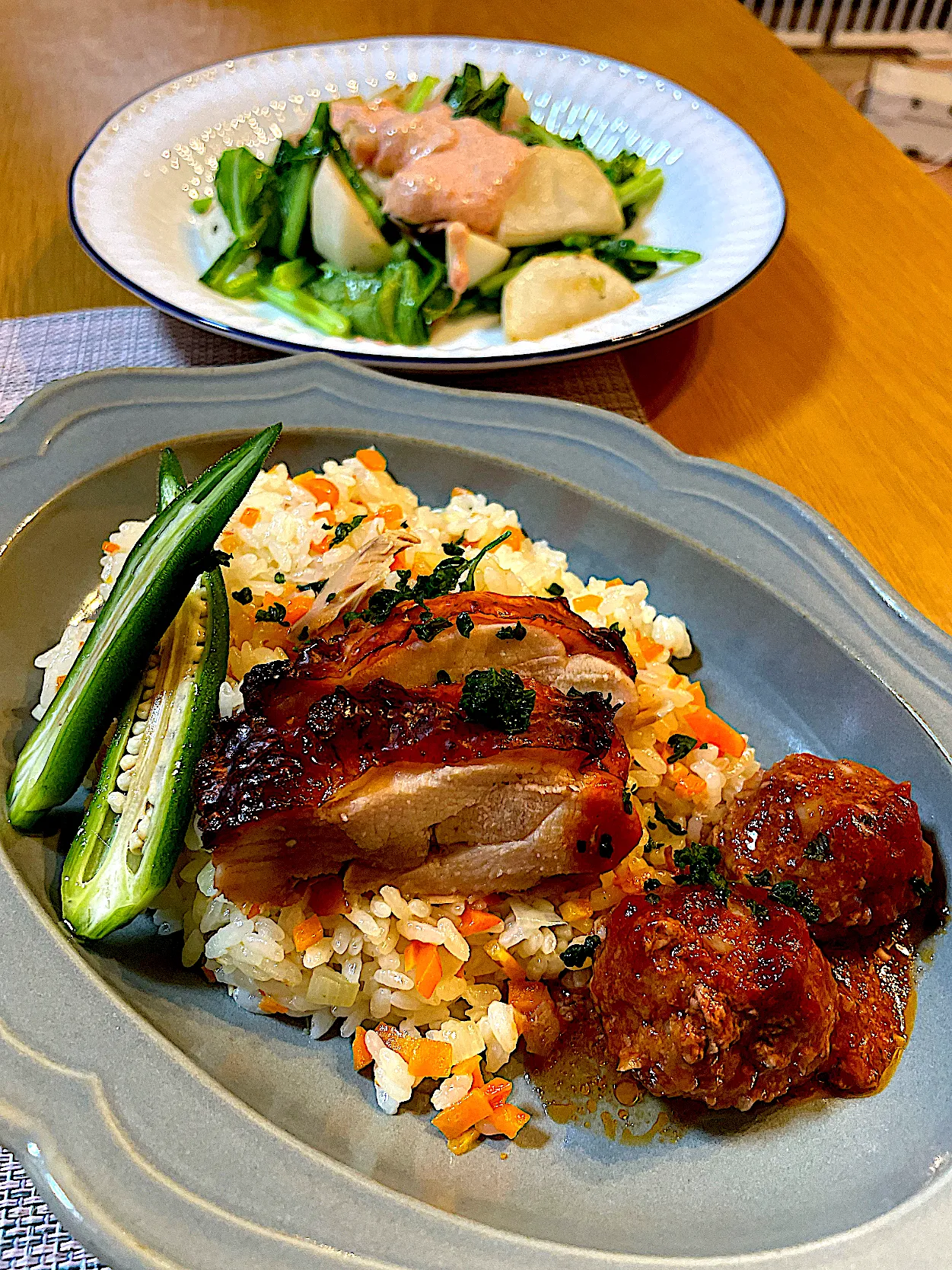 #にんじんとツナのピラフ#グリルドチキン#ミートボール