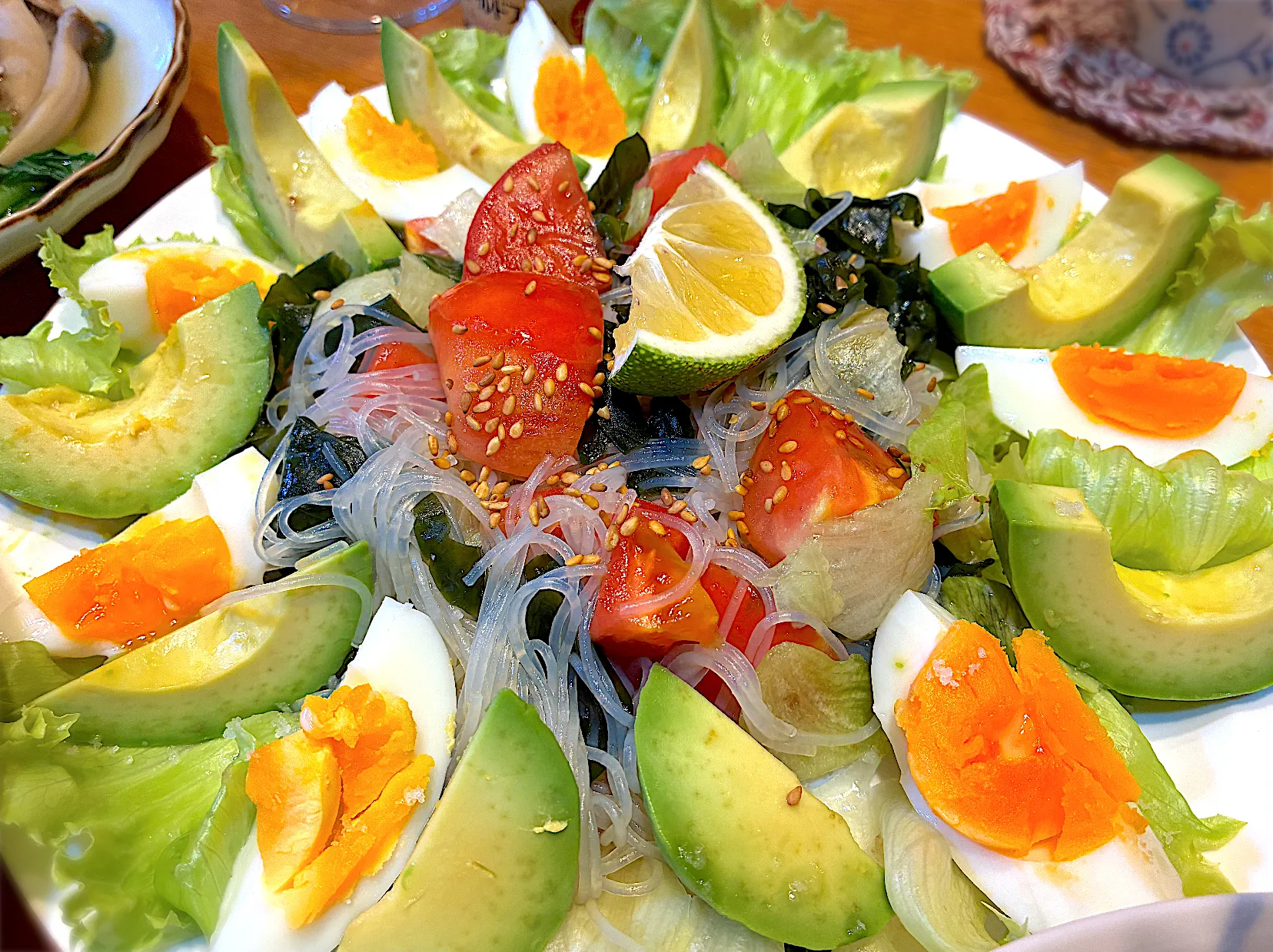 サラダ(ワカメ・春雨・トマト・アボカド・ゆで卵)|じゅんさんさん