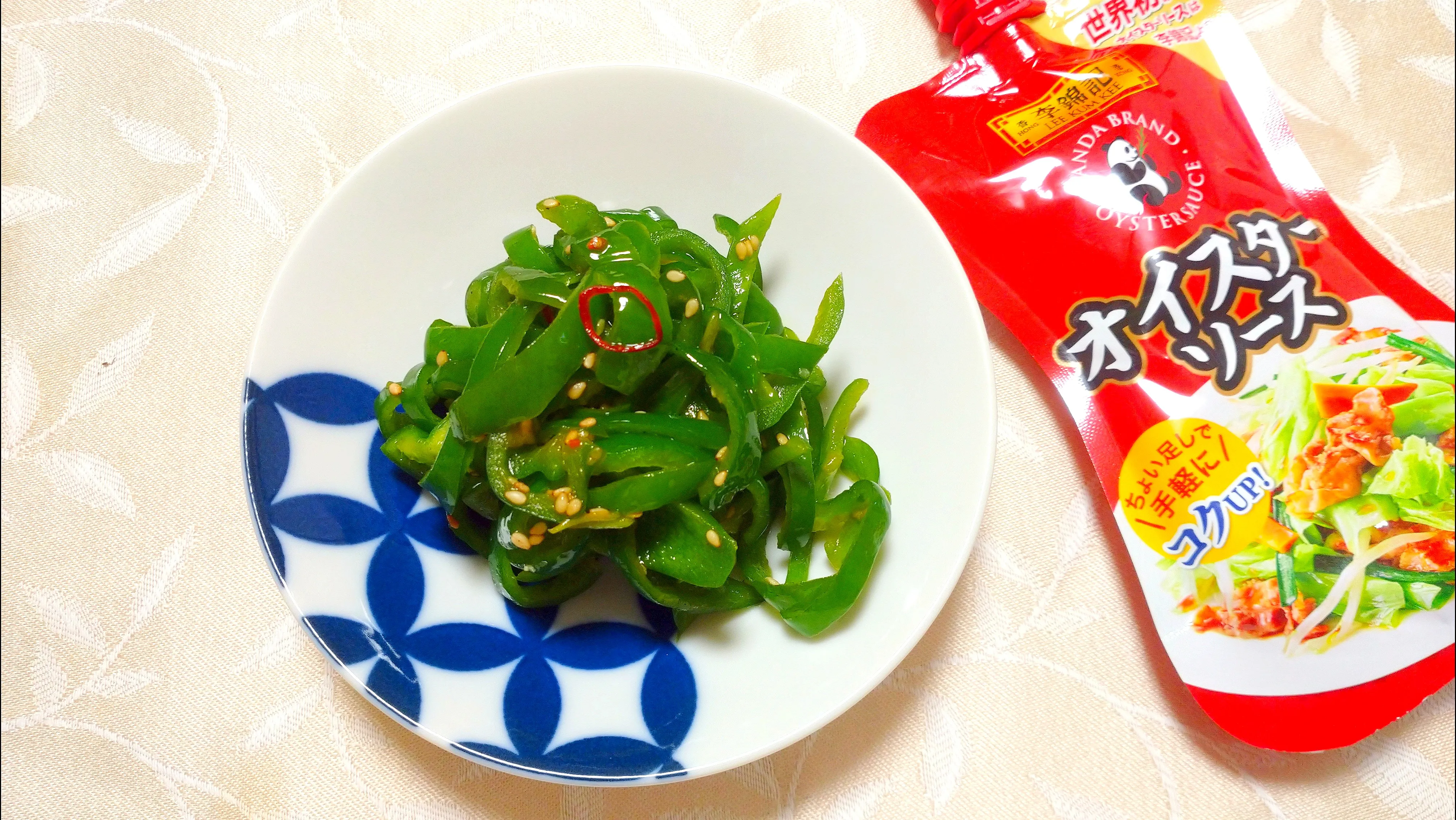 塩、砂糖、胡椒はほんの少しで胡麻油でピーマンを炒め、輪切りの唐辛子を入れて仕上げにオイスターソースを回しかけて馴染んだらできあがりです。