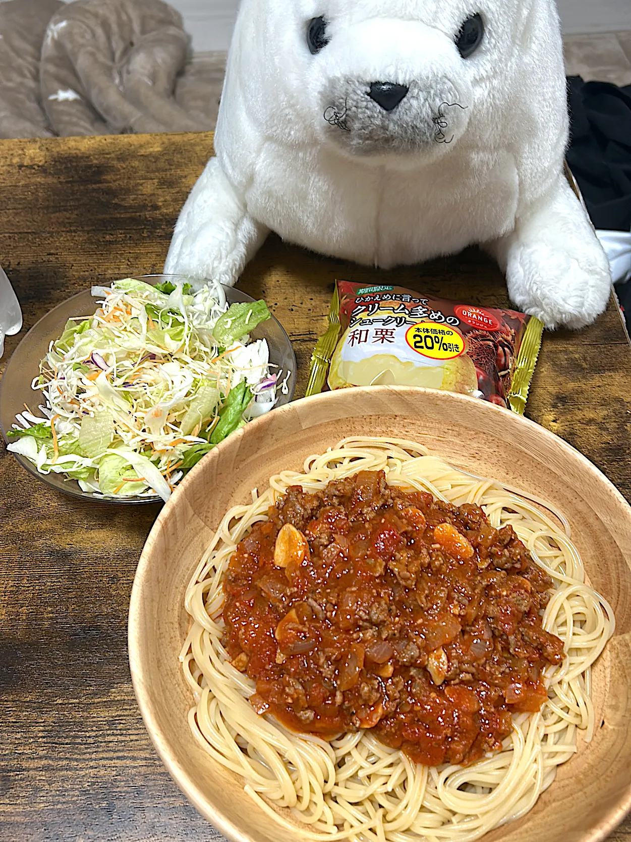 #ミートソースパスタ #サラダ #和栗シュークリーム #男子大学生 #人形 #一人暮らし