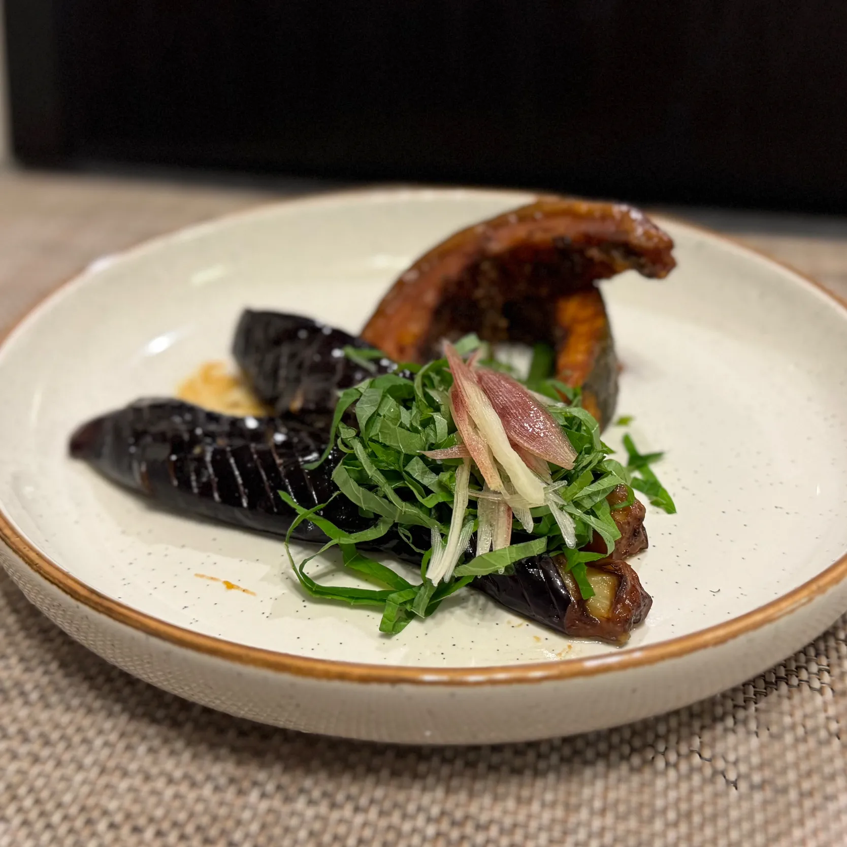 揚げた茄子とかぼちゃに、液みそ「料亭の味」と「ひいふぅみそ汁しじみ」、みりんで作った味噌だれを絡めて完成です。