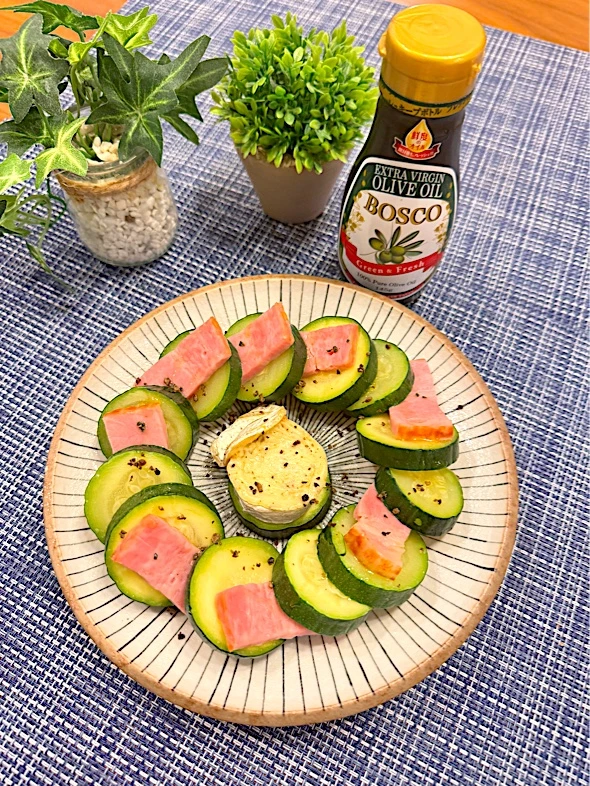 ズッキーニとベーコンとブリーチーズを蒸して、モニター当選でいただいたBOSCOエキストラバージンオリーブオイルと生黒胡椒をかけて😋 #PR