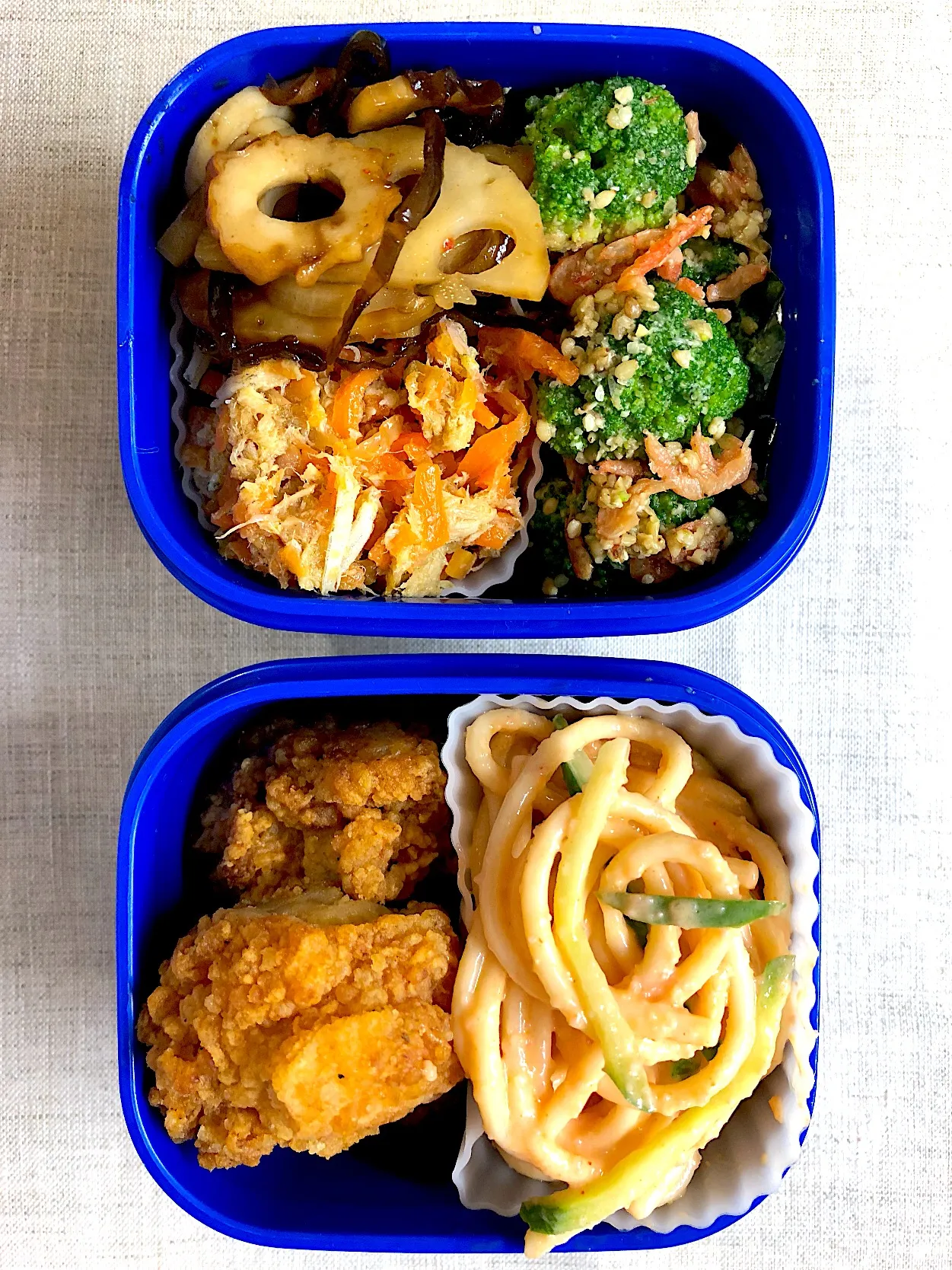 鶏唐揚げ、明太パスタサラダ、ツナと人参の梅炒め、レンコンと竹輪の塩昆布和え、ブロッコリー胡麻和え。白飯は保温容器。天気☁️ 最高気温24(-7)℃予報。
