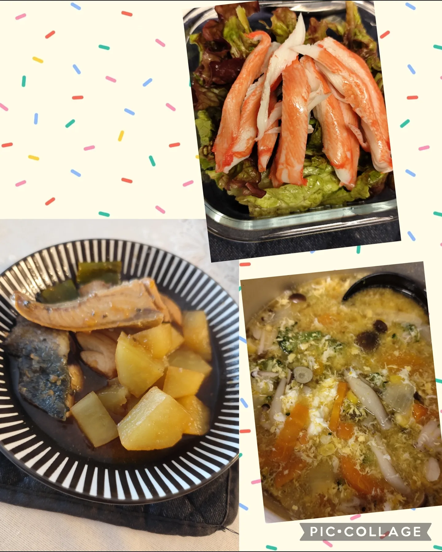 ぶり大根、カニカマサラダ、具沢山かき玉スープ