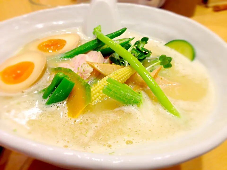 鶏白湯に味玉、季節の野菜トッピング。濃厚クリーミーなプースーでした。