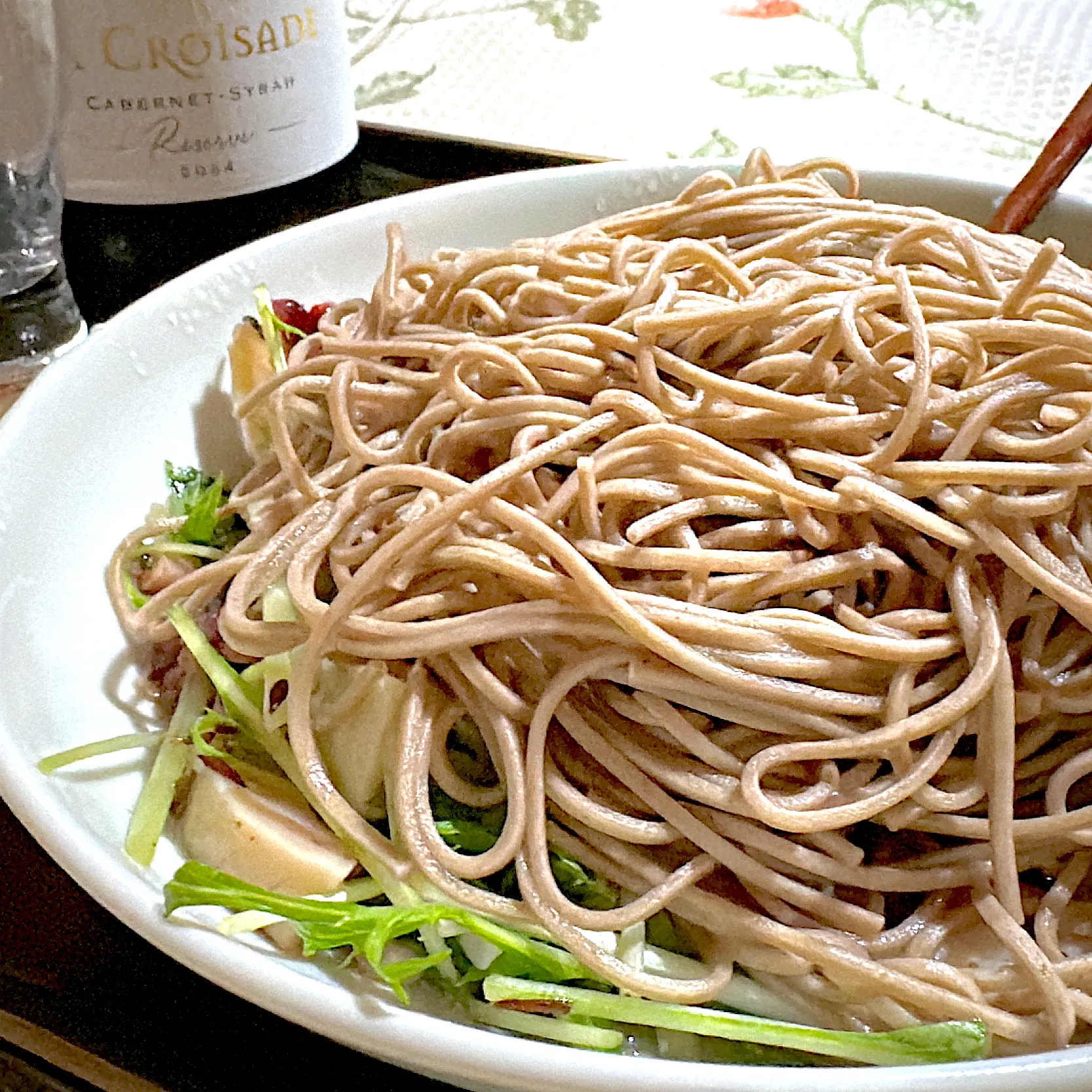 普通はそばの上にサラダやろ〜と思いながら。蕎麦が茹で上がるのを待ちきれずにサラダを先に盛ったからみごとな逆転劇。まあ、混ぜて食べるからどっちが先でもええねんけど。