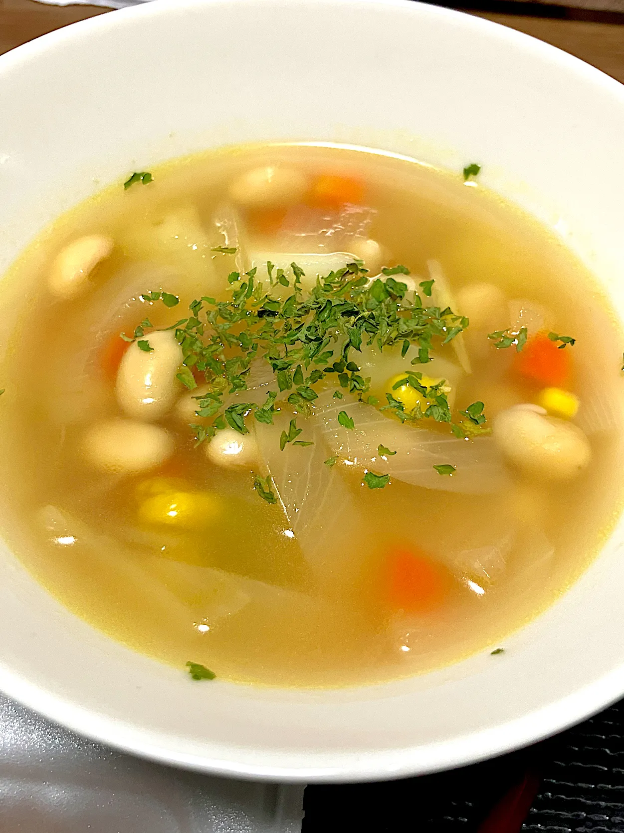 蒸し大豆とじゃがいもの塩糀コンソメスープ