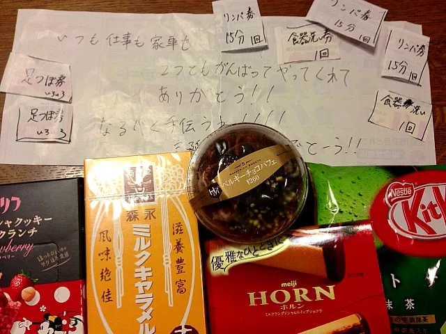 今日は私の誕生日です。40+?歳になりました💧だけど健康に今日をむかえられて幸せです😊子供達がコンビニのお菓子とチラシの裏に書いた肩もみ券、足つぼ券、食器洗い券をくれました。高校生の息子がつくったそうです☺幼稚園の時からやることがかわってないです〜😱土曜日に美味しいもの食べにいきます💕