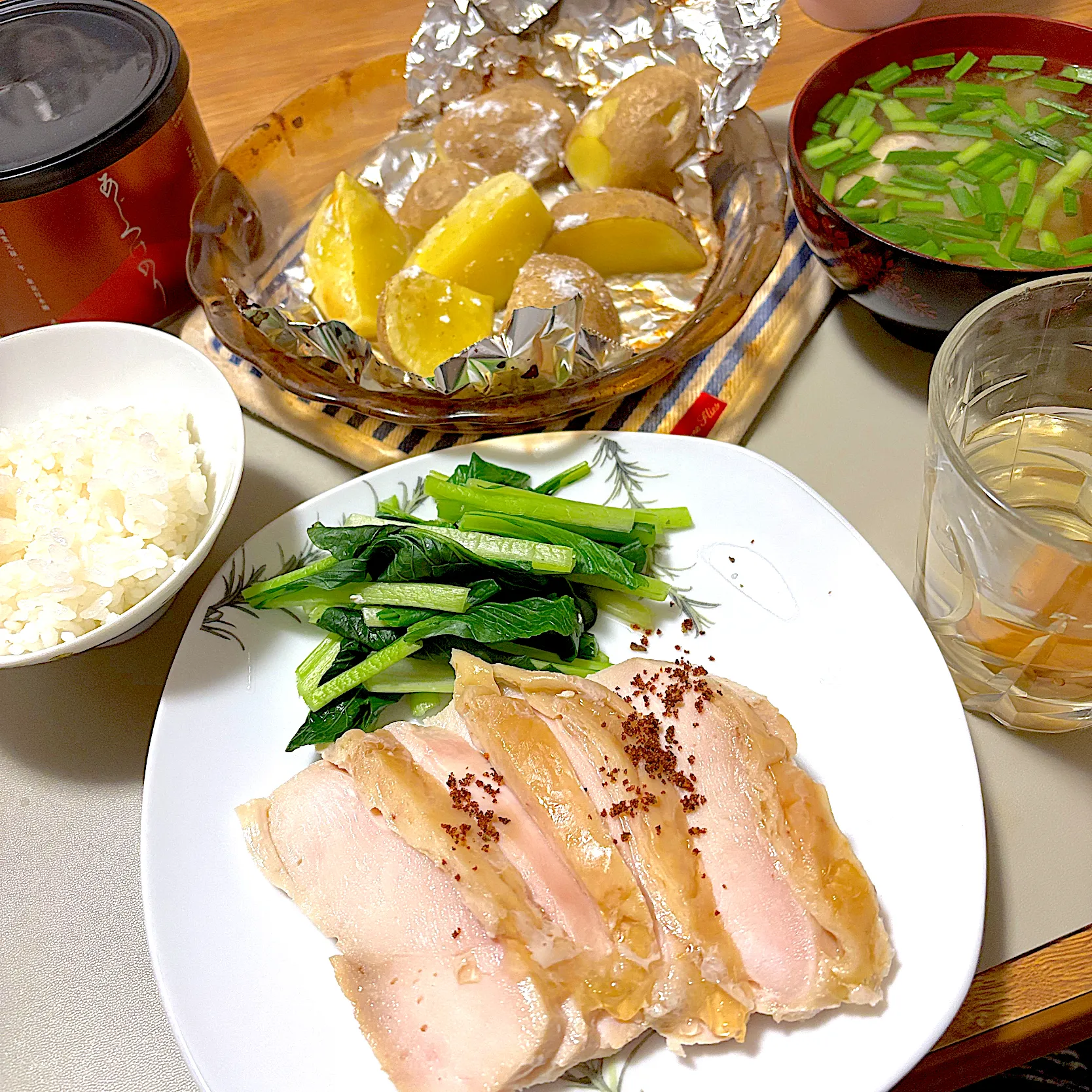 2025/11/04 バーミキュラで鶏ハム、小松菜おひたし、じゃがいもグリル