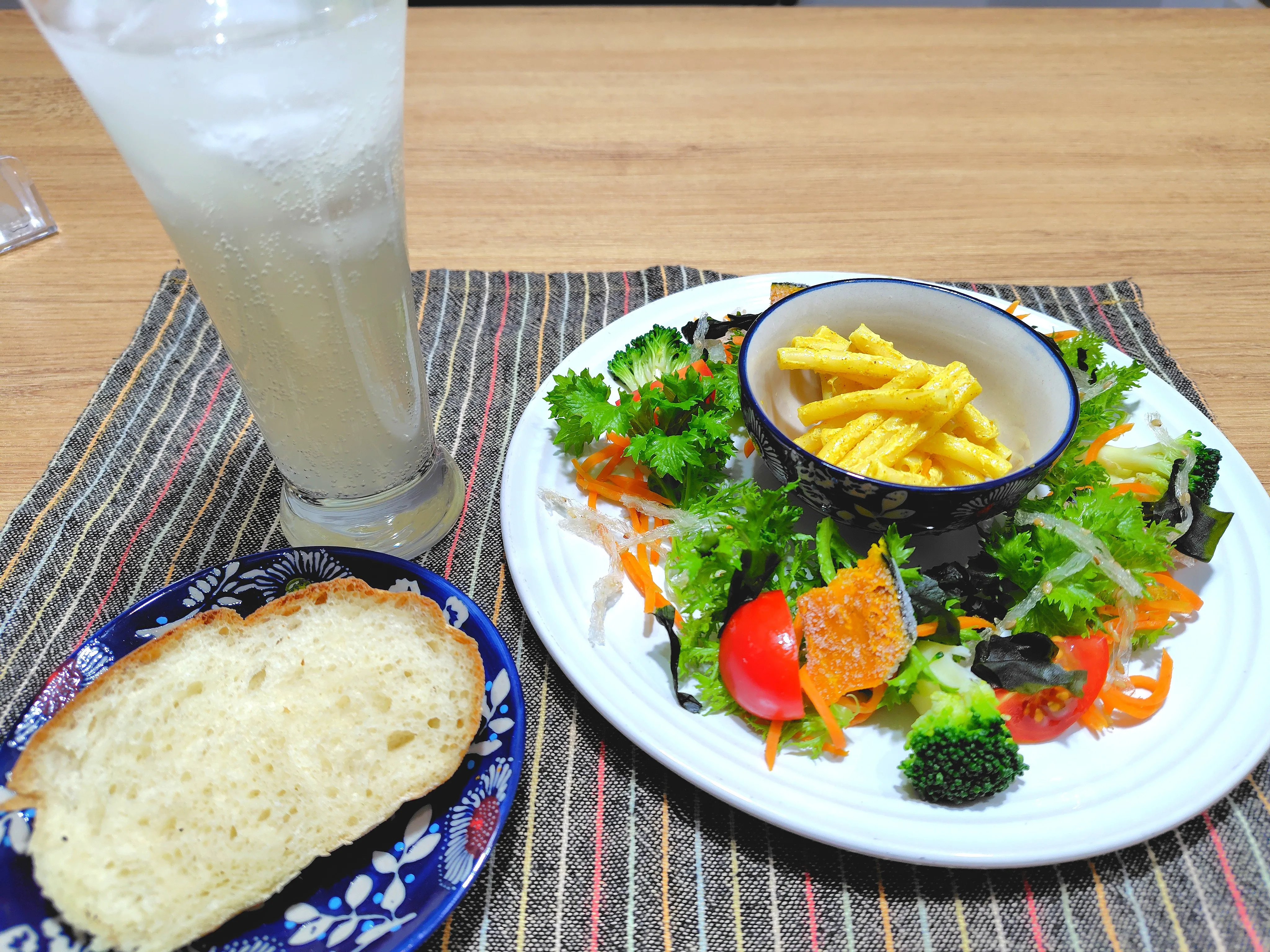 わさび菜、人参ラペ、ブロッコリー、焼きかぼちゃ、トマト、糸寒天のナムル、わかめ、カレー味のマカロニサラダ