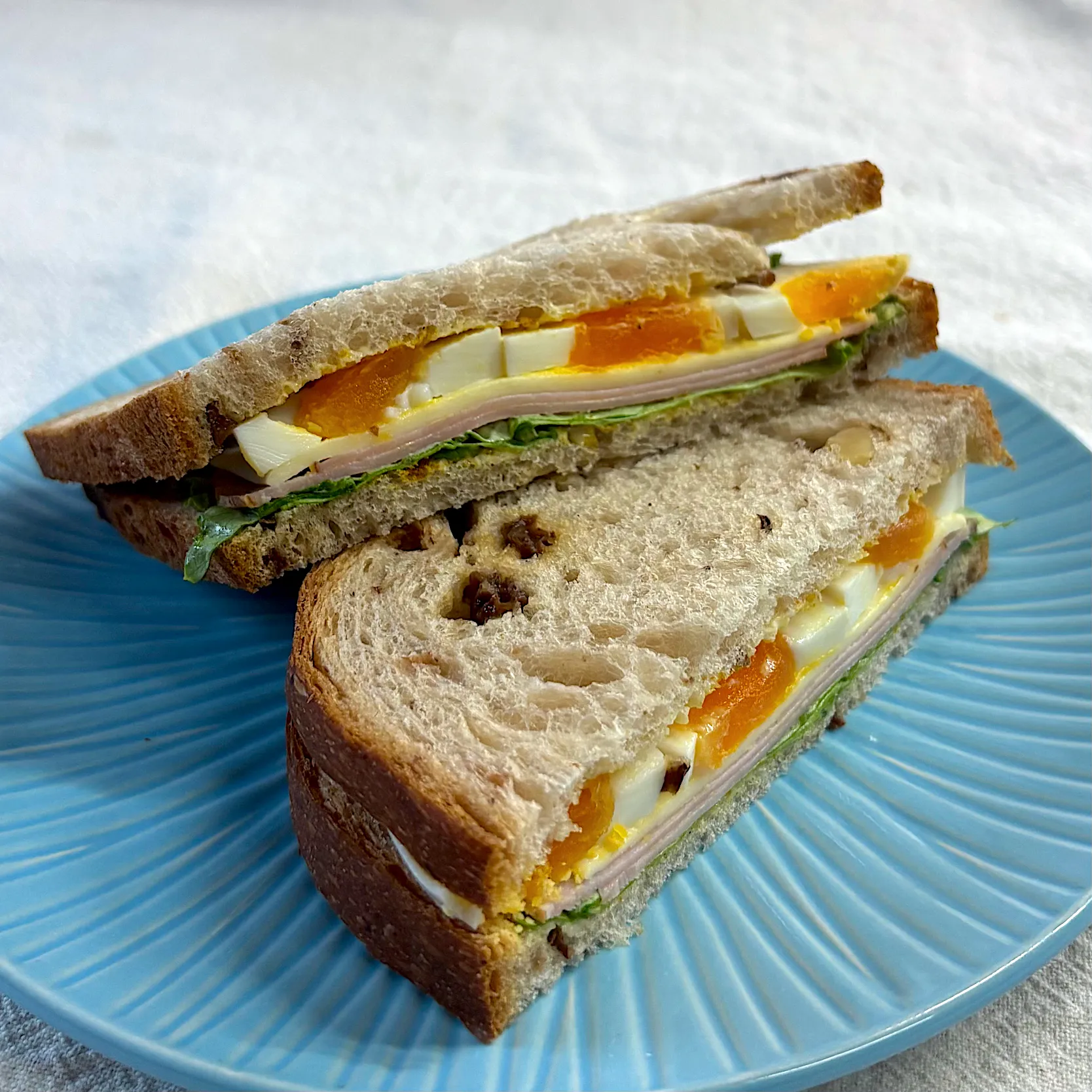 カレーマヨ、味たま、ハム、レタス、チーズをレーズンパンでサンドしました🤗 #かっちゃん杉 #クックパッドアンバサダー2023かっちゃん杉 #かっちゃん杉の朝ごはん #かっちゃん杉のサンドイッチ