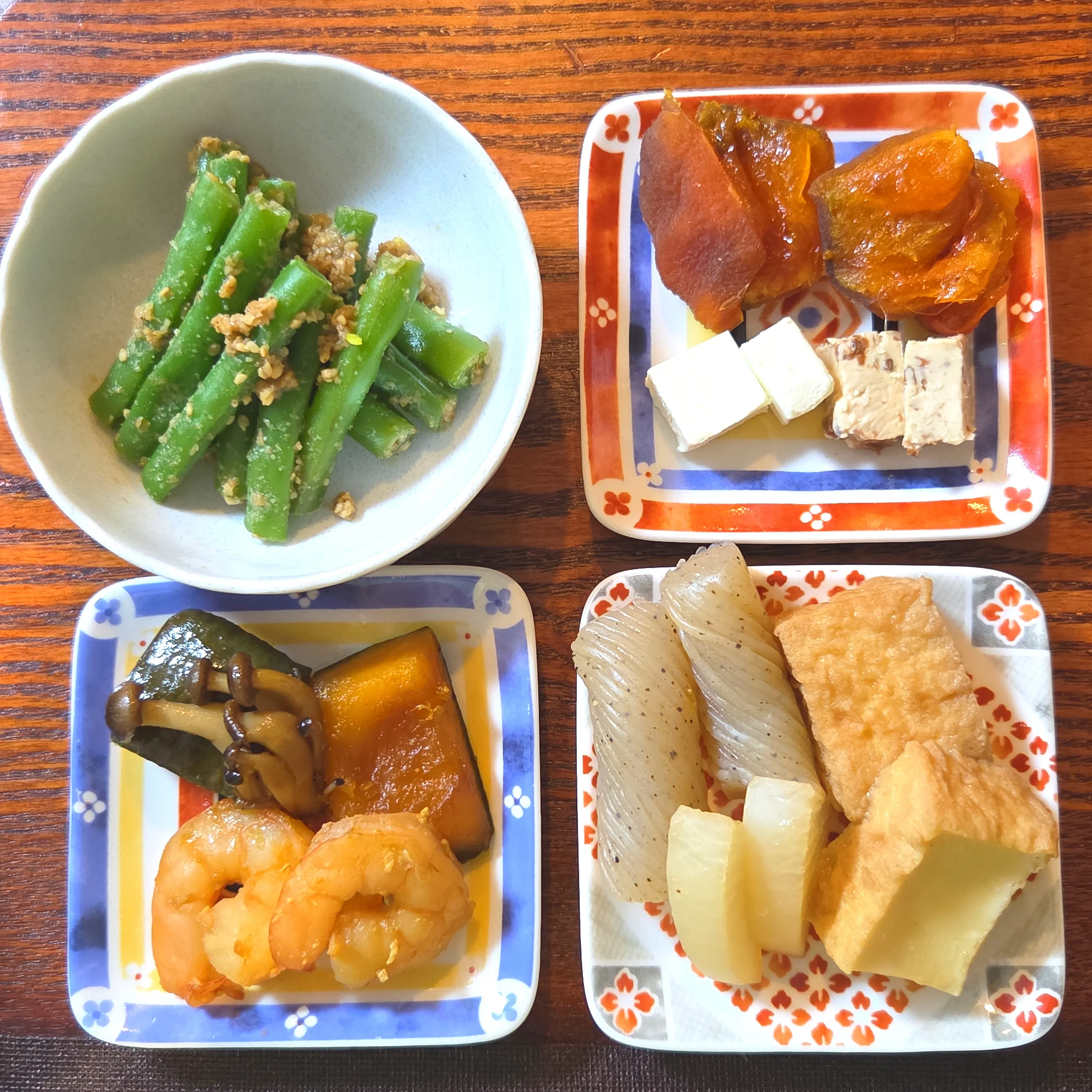 #かぼちゃの煮物 #厚揚げの煮物 #いんげんの胡麻和え #干し柿とチーズ