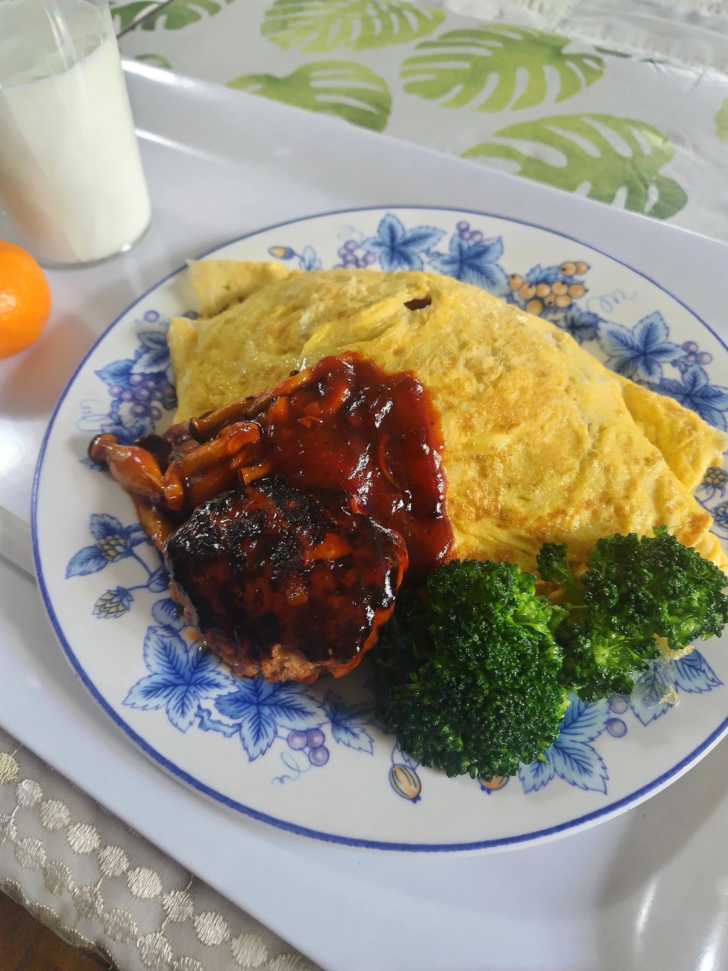 昨日の残りで、オムスパ✨キノコのハンバーグソースがけランチです✨
