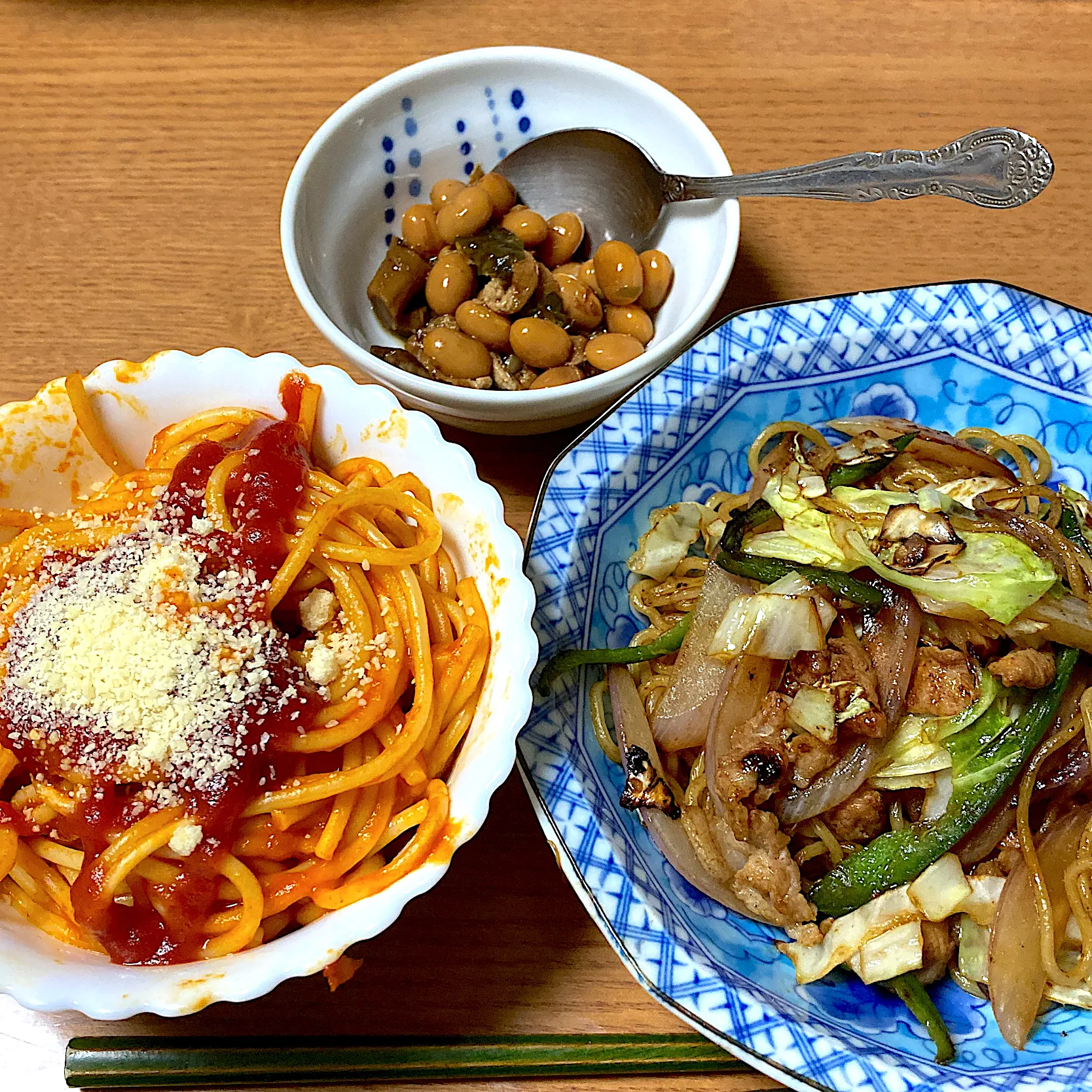 #冷凍ナポリタン #大豆の煮物 #晩御飯 #麺と麺です