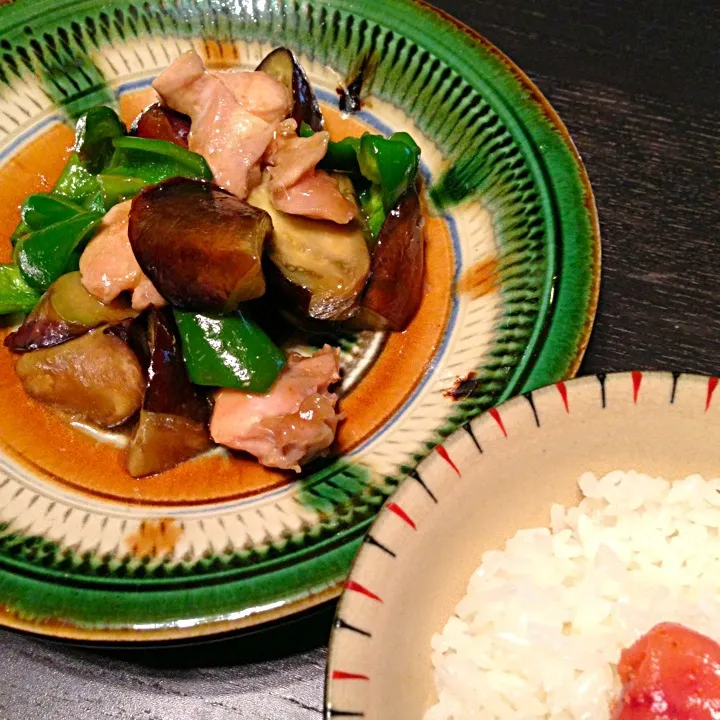 鶏肉と茄子ピーマンの中華炒め&明太子ごはん|アキコさん
