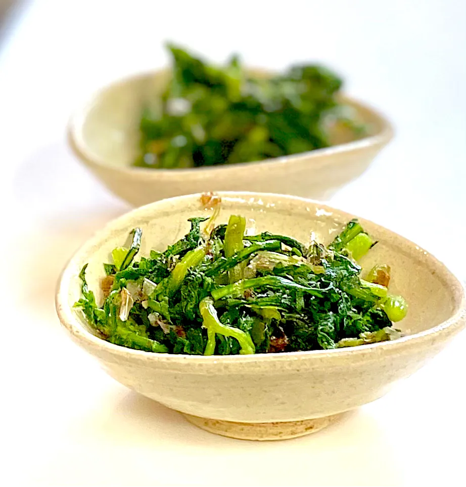 塩を加えて茹でた春菊を冷水で色止めして、鰹節、砂糖、醤油を加えました。