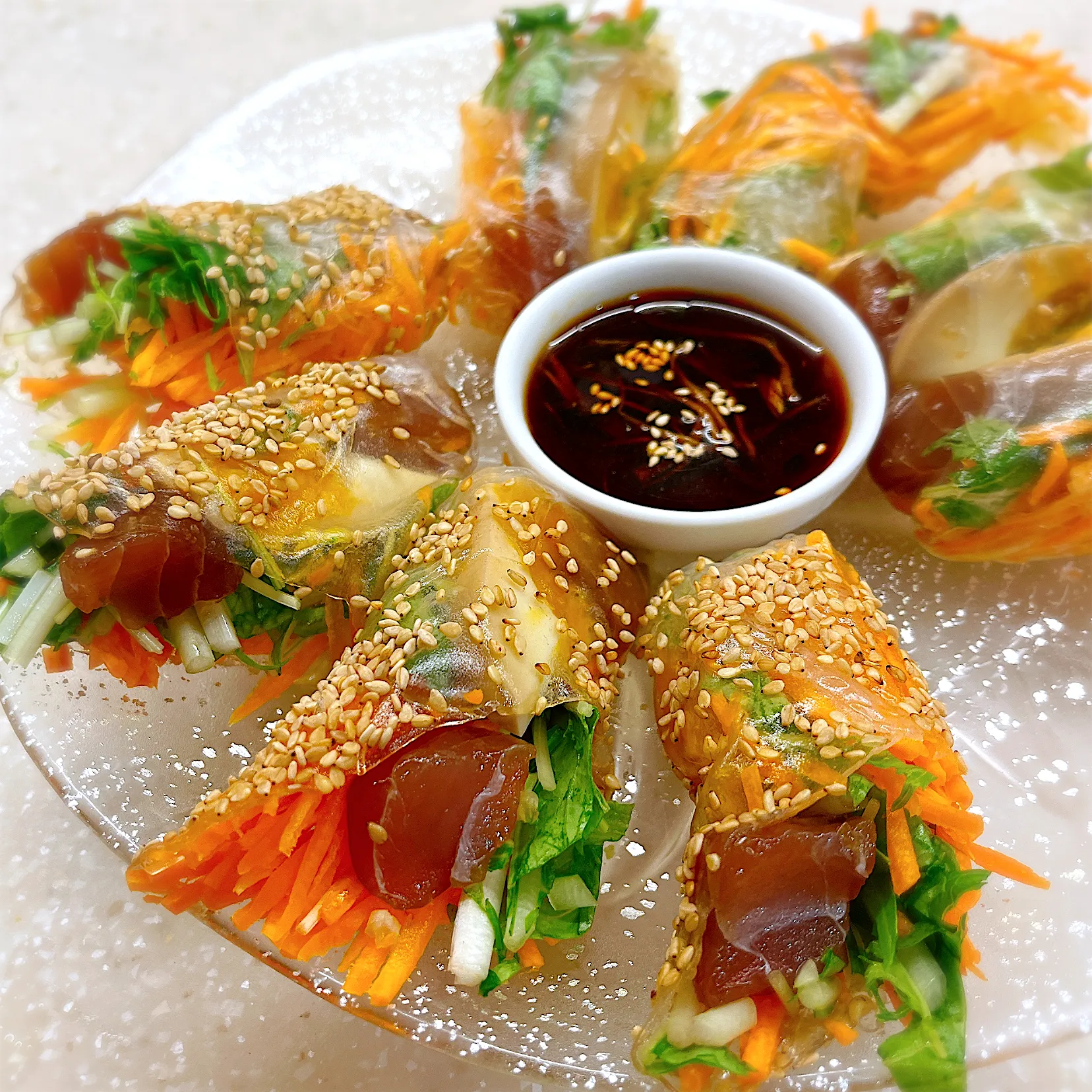 先日のライスペーパーレッスンのYouTube動画を拝見しました😊とっても美味しそうでしたが素麺がなかったので、今回は漬けマグロと味玉を巻いてみました🐟