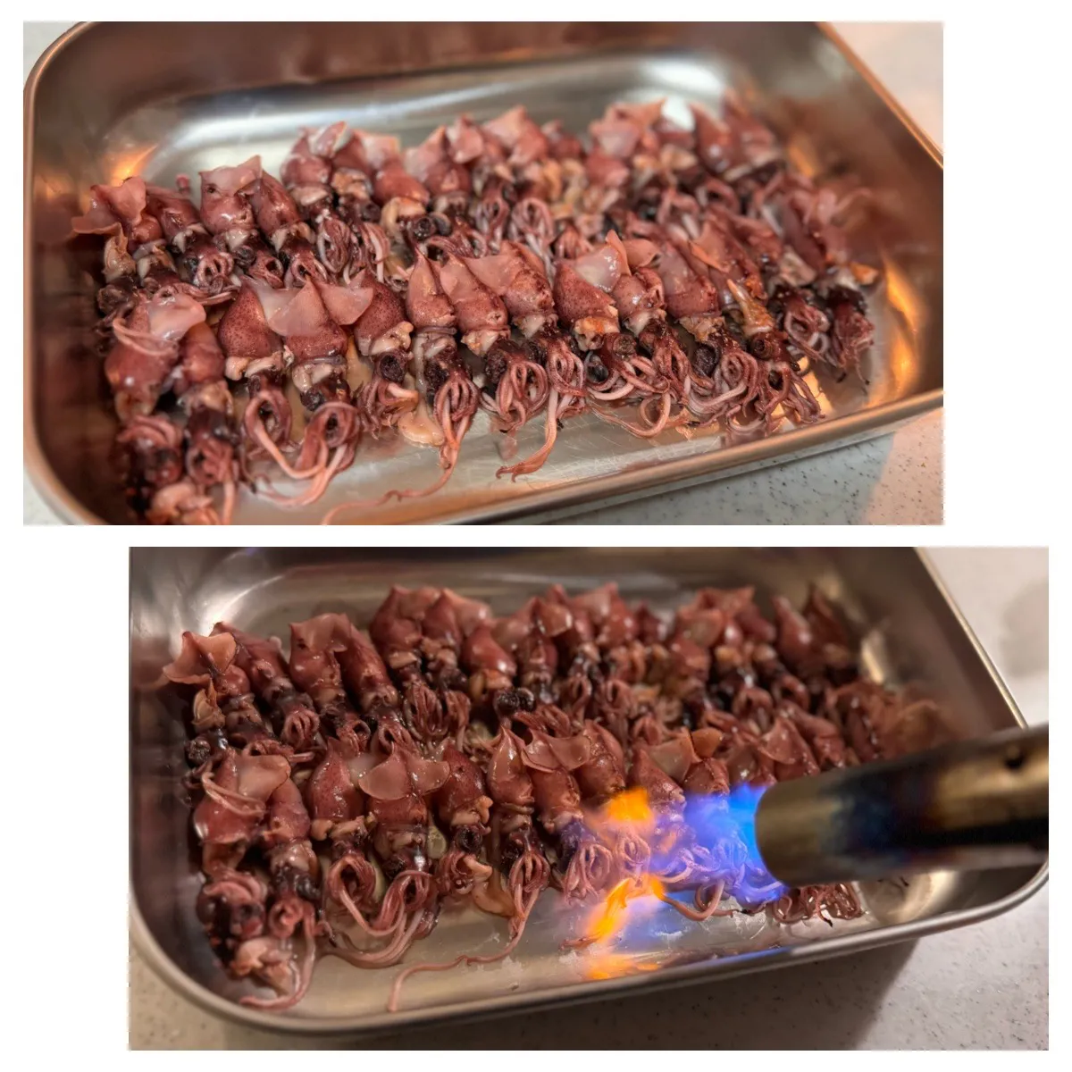 兵庫県産の新鮮なホタルイカを下処理してバーナーで炙り、香ばしく仕上げました。ニンニクと唐辛子を効かせたオリーブオイルに玉ねぎとトマトを加えたソースで味わい深く。