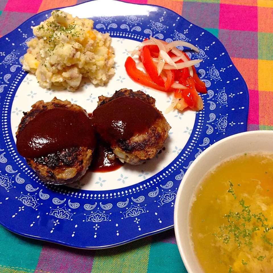 ハンバーグ、ポテトサラダ、パプリカのマリネ、コンソメスープ