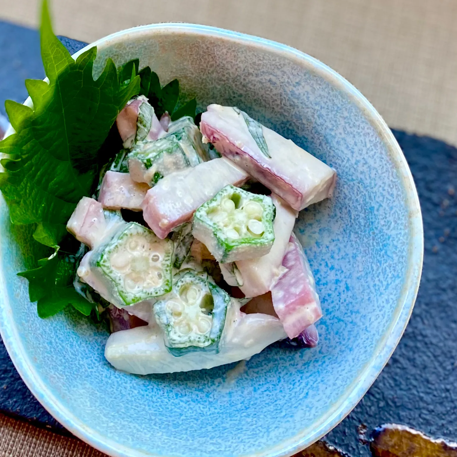 ボイルイカ、オクラ、青シソ