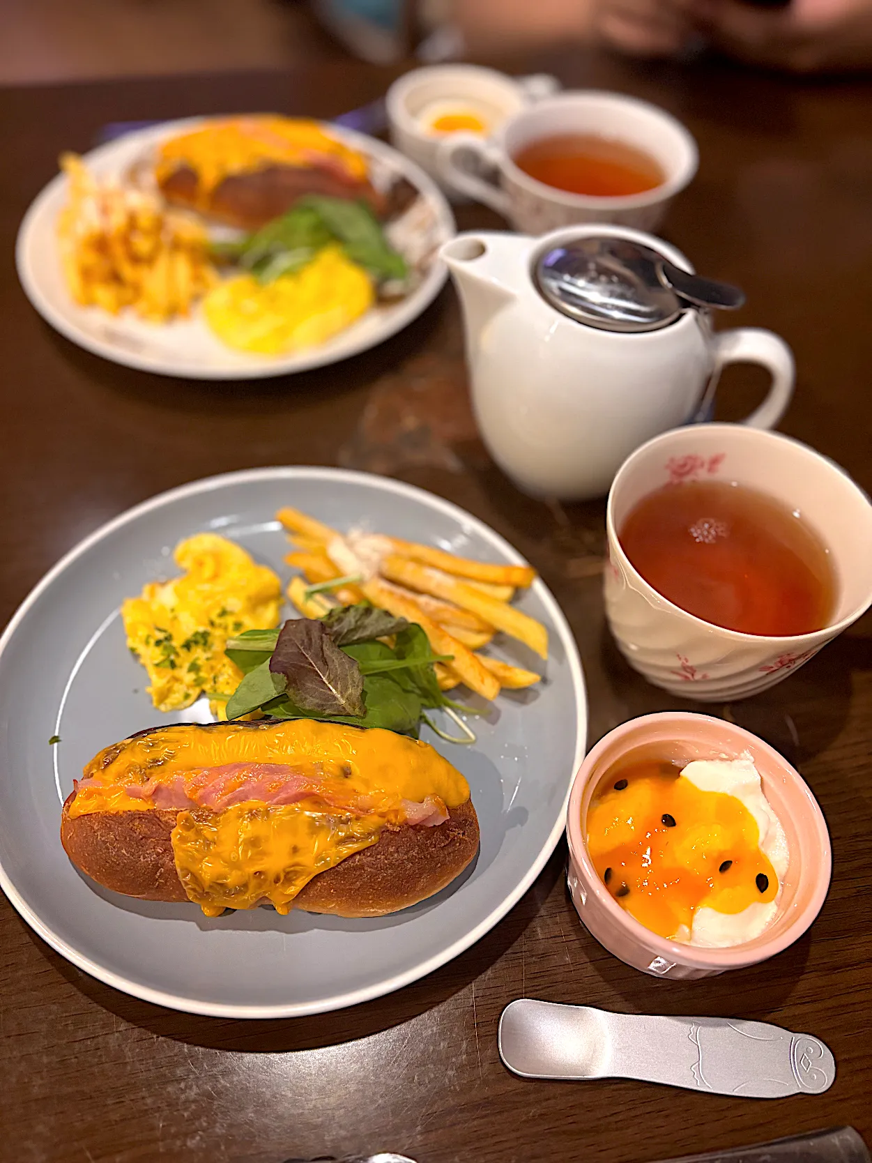 スクランブルエッグ フレンチフライ ソフトフランスの生ハムチーズトースト ヨーグルト アールグレイティー