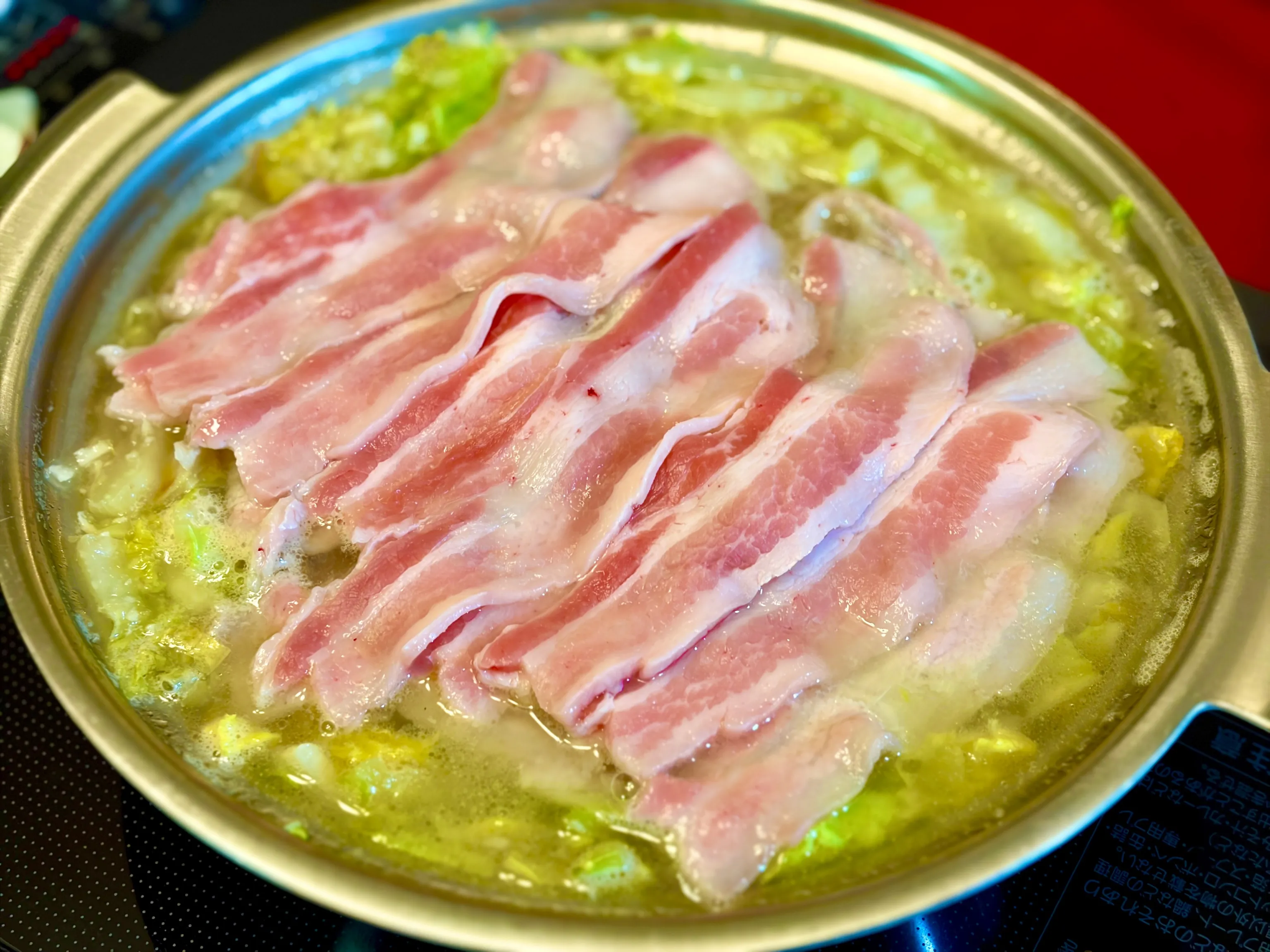 鍋にごま油と唐辛子入れてラー油的なもの作って、白菜炒めてウェイパーとニンニク、生姜と水入れて豚バラ肉入れたら出来上がり👏