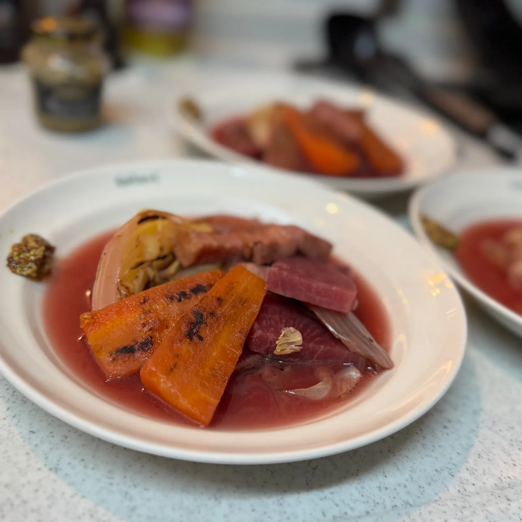 野菜ごとにマヨルカ島の塩で焼き目を付けて旨みを引き出して、ベーコンも焼いてからル・クルーゼで煮込みました。